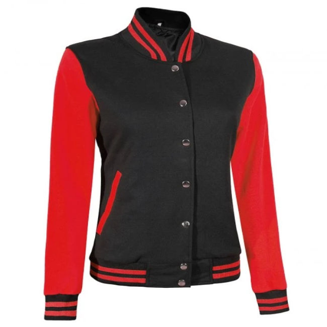 แจ็คเก็ตเบสบอลเลตเทอร์แมนสำหรับผู้หญิงเสื้อบอมเบอร์มีกระดุมสีแดงสีดำสำหรับใส่กลางแจ้ง