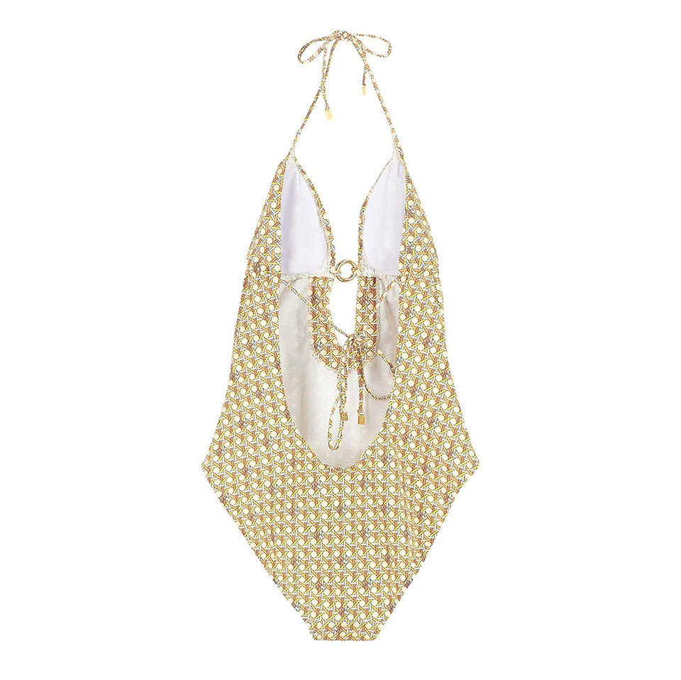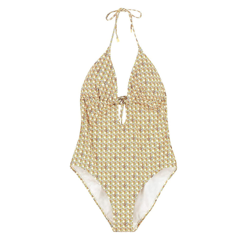 ชุดว่ายน้ำแทนกินี่ของผู้หญิงแบบพรีเมียมผ้าแห้งเร็วเป็นมิตรกับสิ่งแวดล้อมโลโก้ด้านหน้าขอบล่างสูงสำหรับคอลเลกชันบีชรีสอร์ท