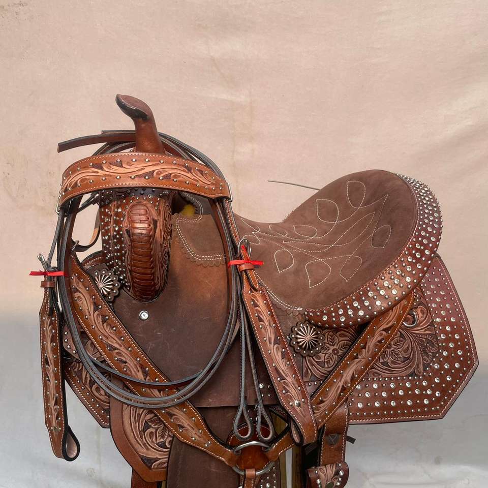 ชุดอานม้าหนังแท้สไตล์ตะวันตกพร้อมงานศิลปะลายไม้ต้นไม้พรีเมียม | ชุดอุปกรณ์ขี่ม้าแบบแฮนด์เมดพร้อมอุปกรณ์เสริมฟรี
