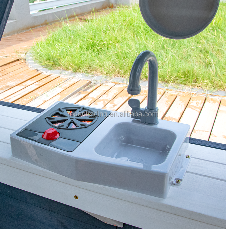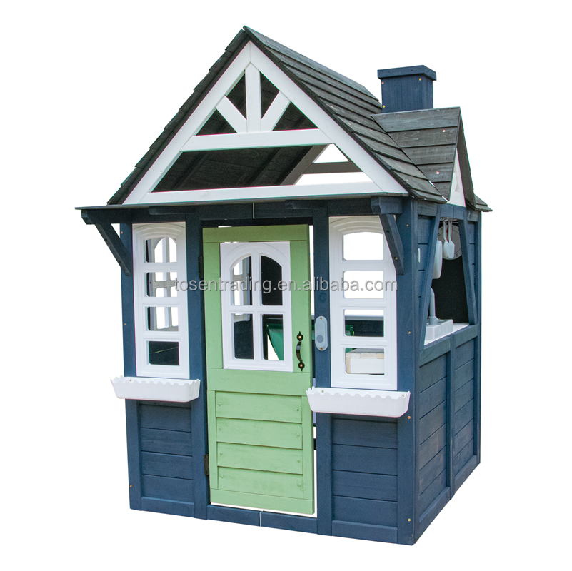 บ้านไม้กลางแจ้งระดับพรีเมียมพร้อมประตูสีเขียว กล่องปลูกดอกไม้ ปล่องไฟ และครัวเล่น - บ้านพักหลังบ้านสำหรับเด็ก
