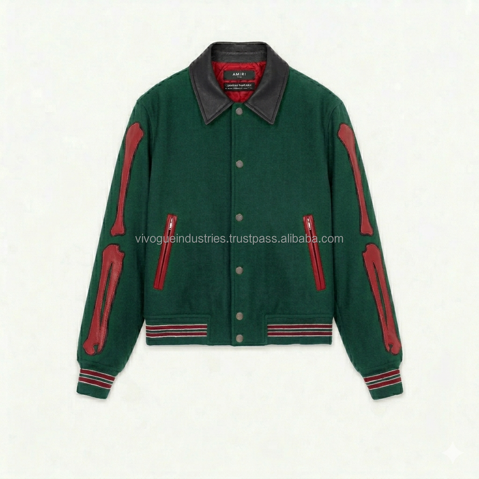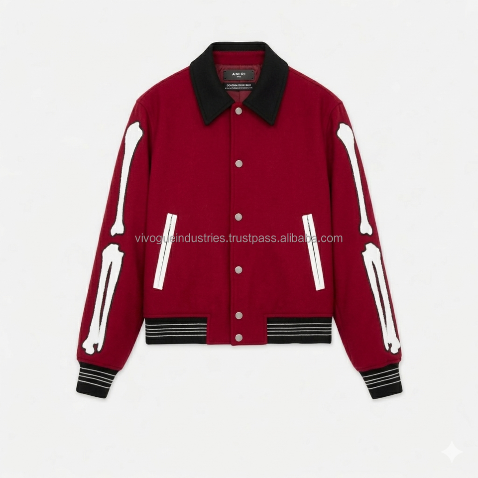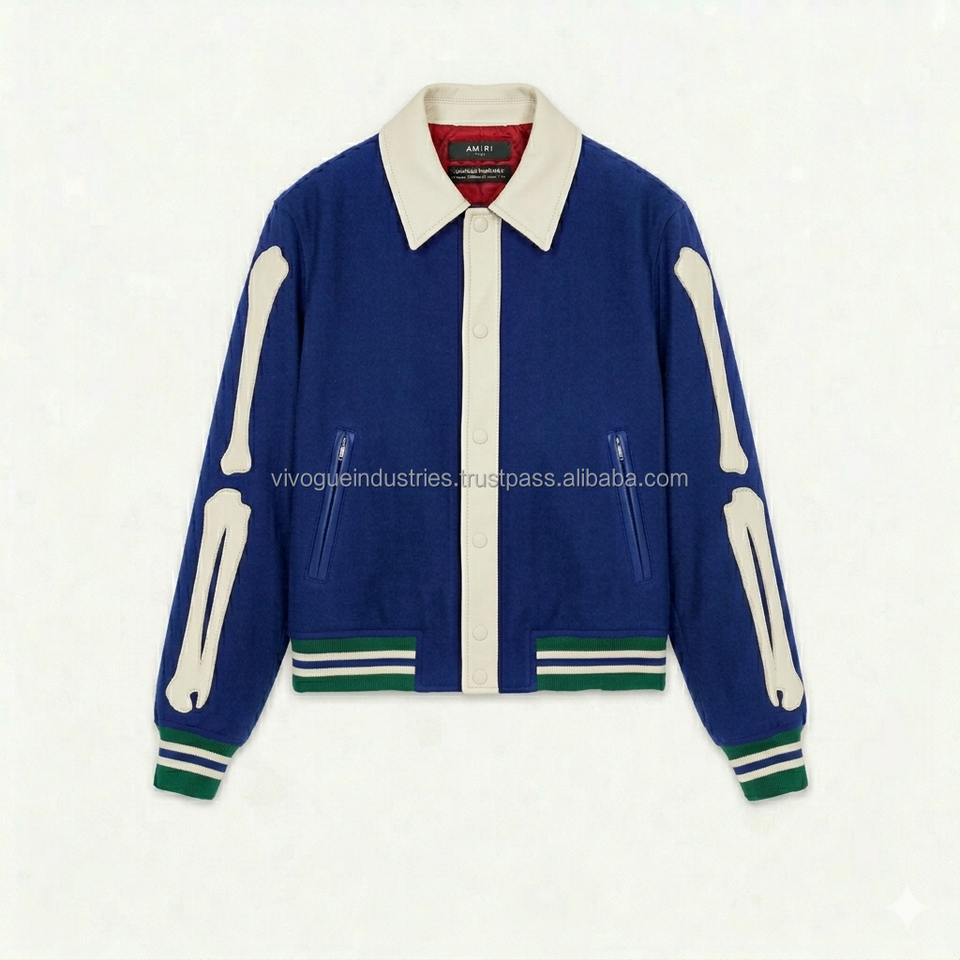 เสื้อแจ็คเก็ตวาร์ซิตี้ผ้าขนสัตว์พรีเมียม ปักลายโครงกระดูก สำหรับฤดูใบไม้ร่วงและฤดูหนาว เสื้อคลุมผู้ชาย สั่งทำได้ ขายส่งเสื้อแจ็คเก็ตขนสัตว์
