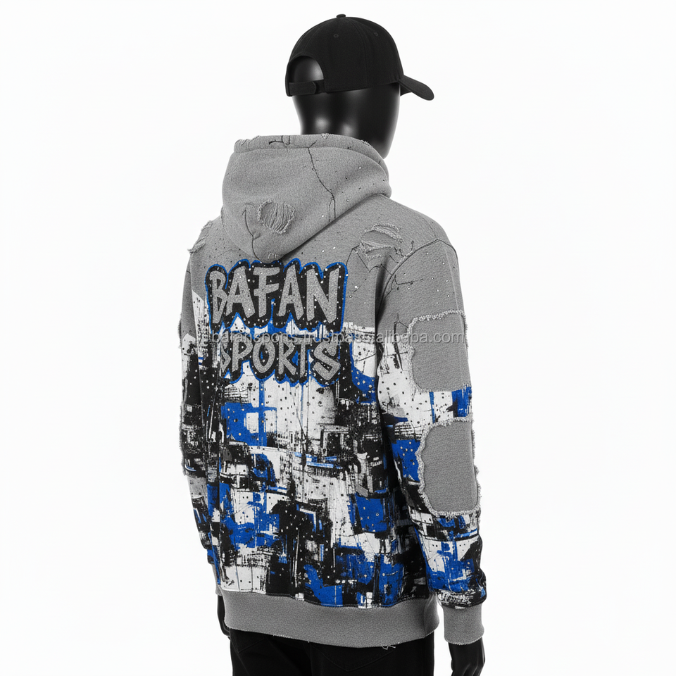 เสื้อมีฮู้ดแบบสวมหัวผ้าฝ้ายผสมแบบพรีเมียมในดีไซน์กราฟิกสีเทาสีน้ำเงินสีดำพร้อมรายละเอียดที่น่าวิตกและมีฮู้ดโลโก้ที่กำหนดเอง