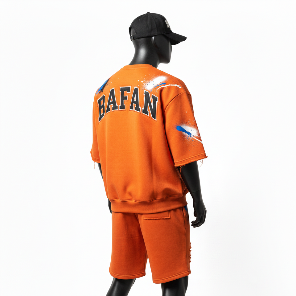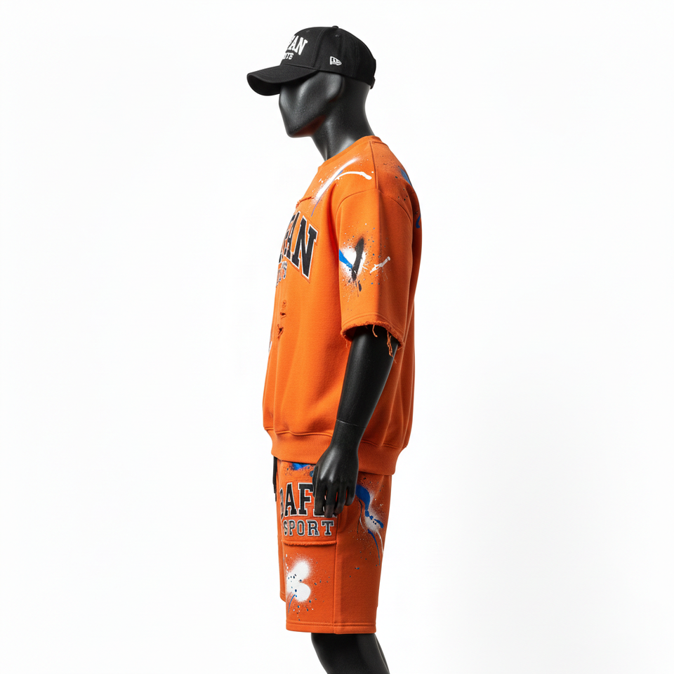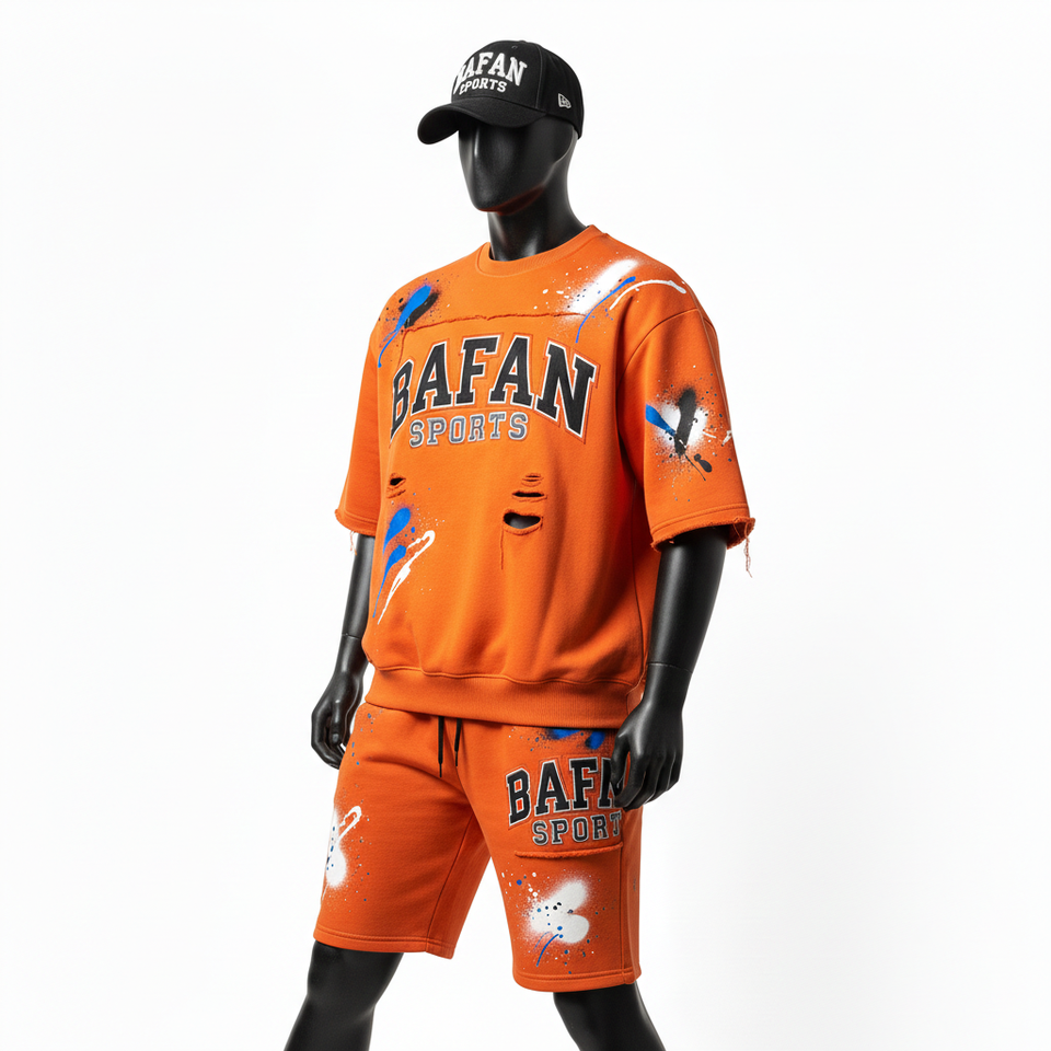 ชุดเซ็ตเสื้อสเวตเชิ้ตผ้าฟลีซคอตตอนพรีเมียมสำหรับผู้ชาย เนื้อผ้านุ่มพิเศษ พิมพ์ลายสกรีนสีส้ม พร้อมโลโก้แบบกำหนดเอง