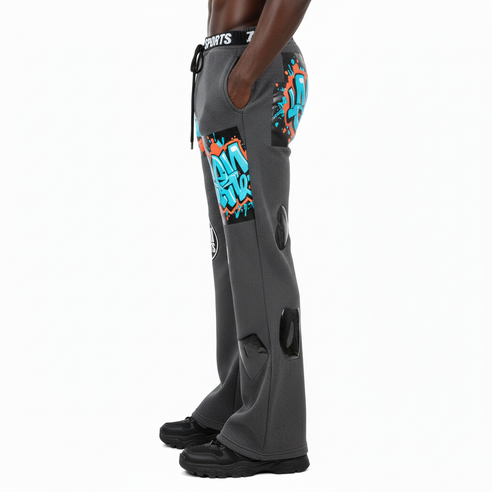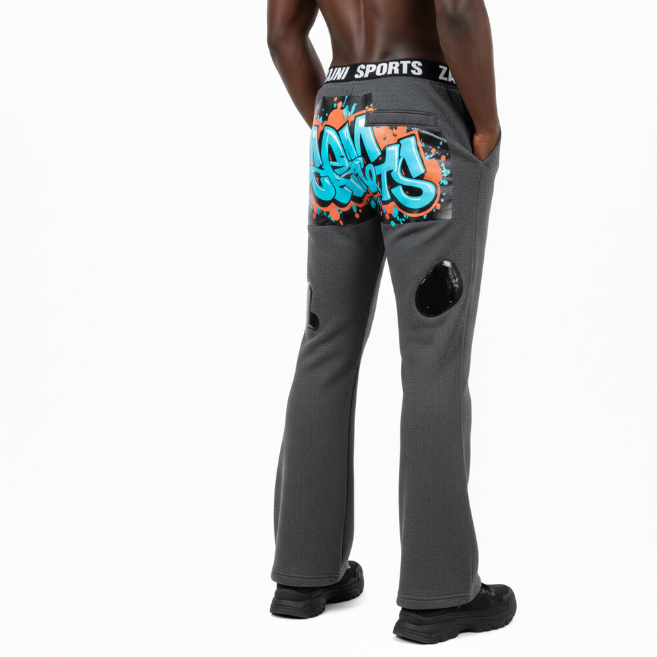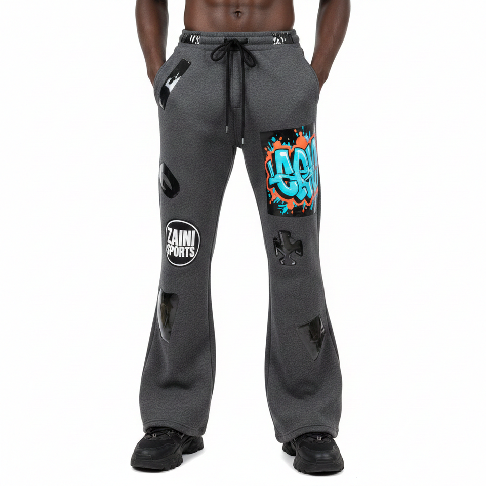 กางเกงขาบานผ้าฟลีซพรีเมียม ผสมผ้าฝ้ายและโพลีเอสเตอร์ เนื้อผ้านุ่มขัดเงา สีเทา พร้อมโลโก้แบบสกรีนด้วยความร้อน