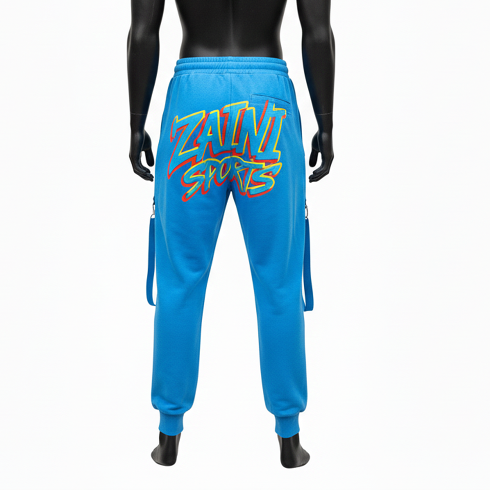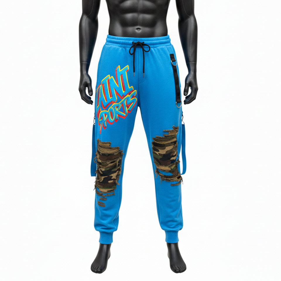 กางเกงจ็อกเกอร์ผ้าฟลีซพรีเมียม ผ้าฝ้ายผสมโพลีเอสเตอร์ เนื้อผ้านุ่ม ขัดเงา ลายพรางสีน้ำเงิน บริเวณเข่าพิมพ์ลายสกรีน โลโก้สั่งทำพิเศษ กางเกงจ็อกเกอร์ผู้ชาย