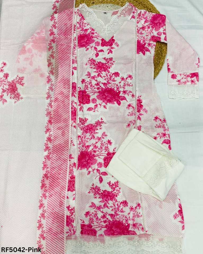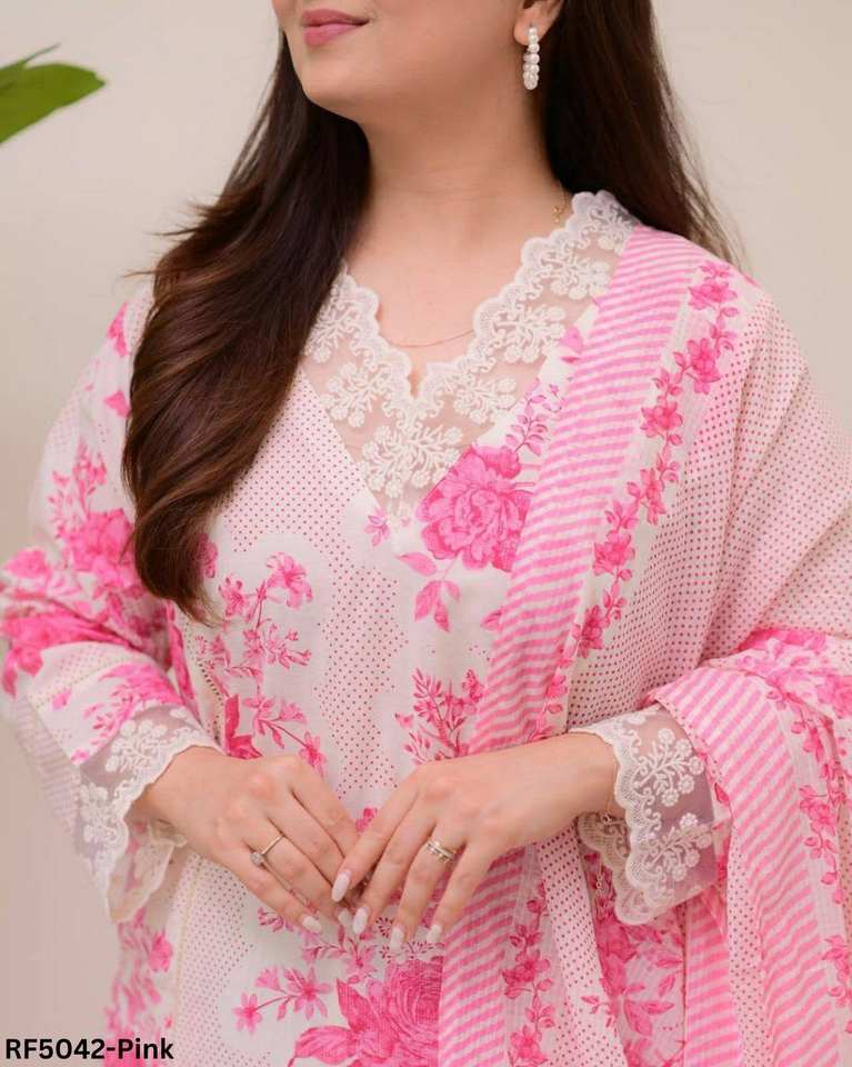 ชุด kurti ผ้าฝ้ายเรยอนลายดอกไม้แบบพรีเมี่ยมสามชิ้นพร้อมกางเกงตรงมีรายละเอียดลูกไม้และเทศกาลสำนักงานลำลอง