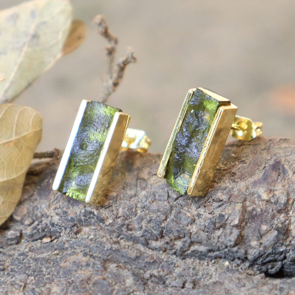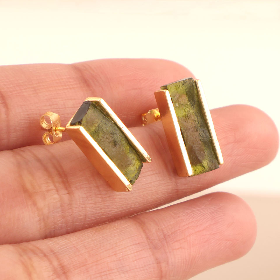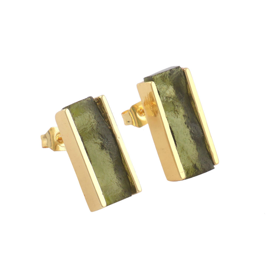 เครื่องประดับพรีเมี่ยมต่างหูเม็ดกลมแบบกดด้านหลังชุบทองแท้จาก Moldavite