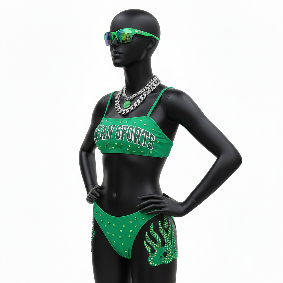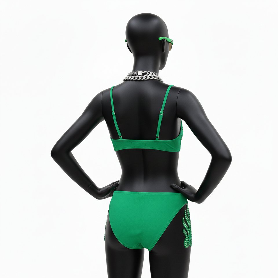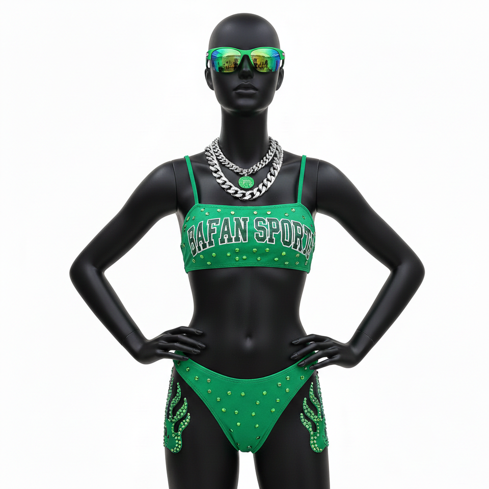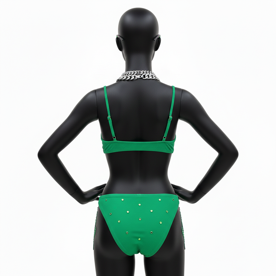 ชุดบิกินี่พรีเมียม โพลีเอสเตอร์ผสมสแปนเด็กซ์ สีเขียว ผ้าเนื้อยืด ประดับคริสตัล แผ่นปักลาย รับสกรีนโลโก้ตามแบบ ชุดบิกินี่สำหรับผู้หญิง