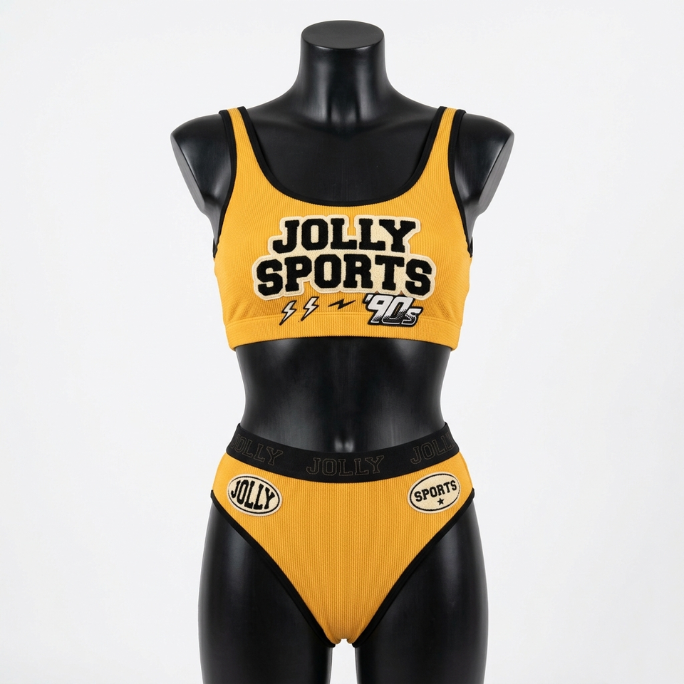 ชุดบิกินี่ผ้าริบโพลีเอสเตอร์ผสมสแปนเด็กซ์พรีเมียม สีเหลืองดำตัดต่อ แต่งลายปักเชนิลล์ ชุดว่ายน้ำสำหรับผู้หญิง