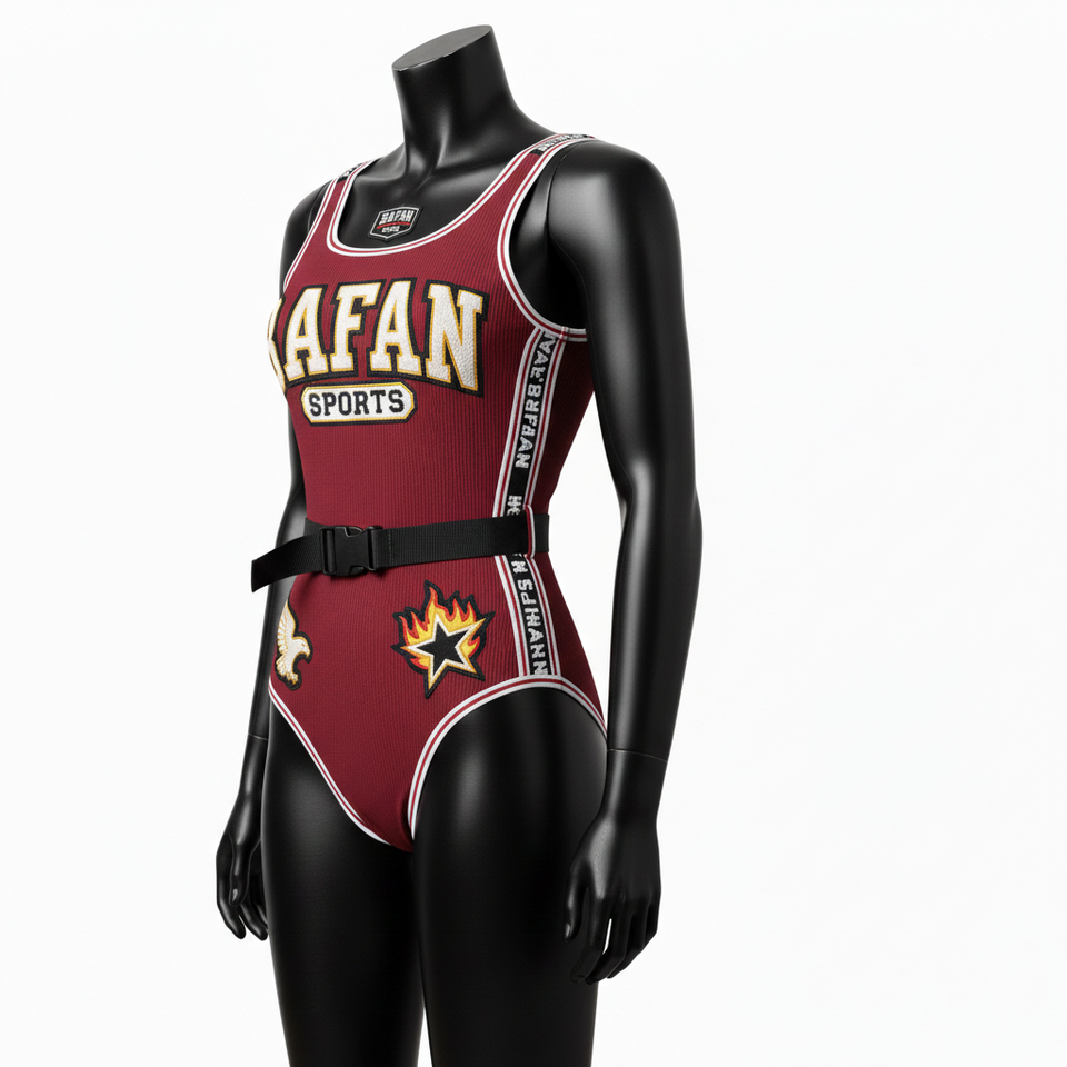 ชุดว่ายน้ำผู้หญิงผ้าโพลีเอสเตอร์ผสมสแปนเด็กซ์คุณภาพพรีเมียม สีแดงเลือดหมู แต่งแถบข้างสีขาว ปักโลโก้ตามสั่ง