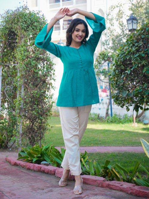 เสื้อผ้าฝ้ายเนื้อแน่นคุณภาพพรีเมียมสำหรับผู้หญิง ชุดเดรสฤดูร้อนขายส่ง สีเทอร์ควอยซ์ แขนกระดิ่ง คอกลม สวมใส่สบายๆ