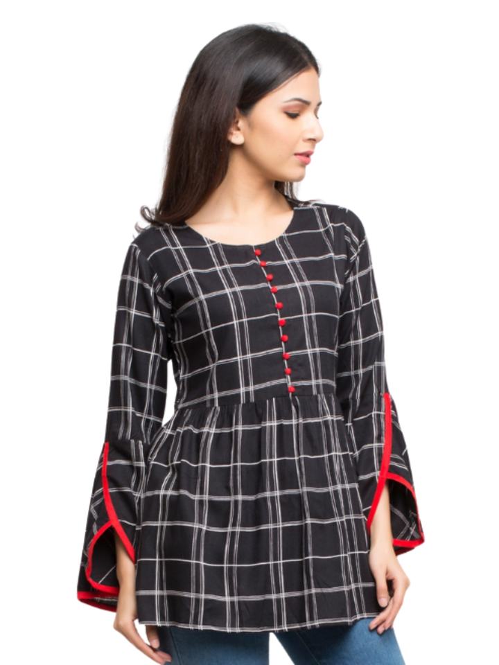 เสื้อผู้หญิงคุณภาพพรีเมียม สีแดงเลือดหมู ผ้าเรยอน ลายตาราง แขนทรงกระดิ่ง คอสีดำ สวมใส่สบาย เหมาะสำหรับฤดูร้อน ชุด 2 ชิ้น ขายส่ง