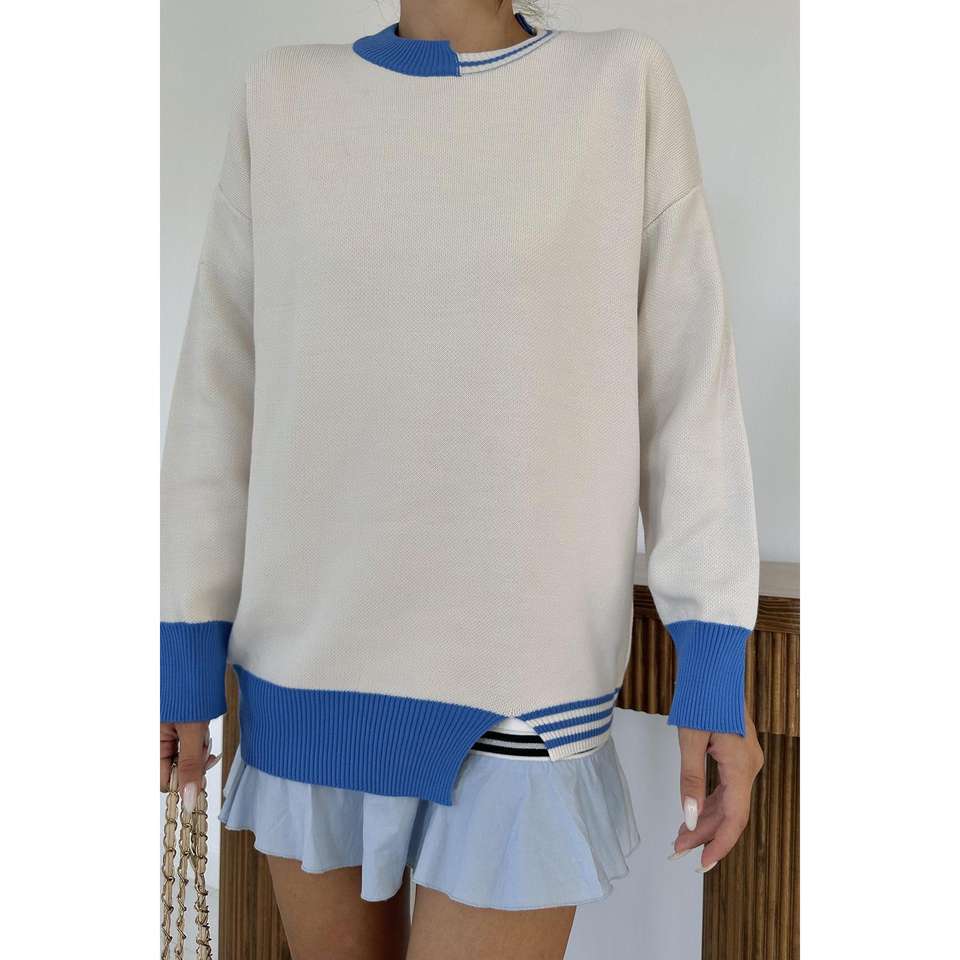 เสื้อสเวตเตอร์ถักสไตล์ Preppy สำหรับผู้หญิง คอปกสีน้ำเงิน แต่งขอบแขนเสื้อ ป้องกันขนร่วง 14 กรัม 320 กรัมต่อตารางเมตร