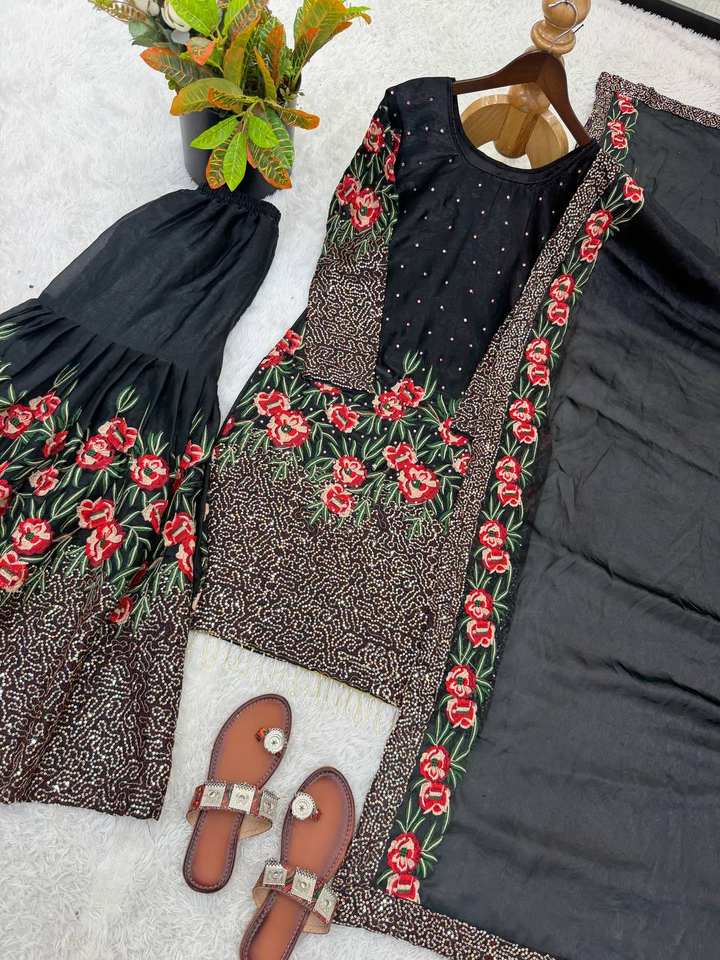 นำเสนอชุดออกงานดีไซน์ใหม่ล่าสุด ประกอบด้วยเสื้อท่อนบน, กางเกงทรงปล่อย, และผ้าคลุมไหล่ พร้อมงานปักสุดประณีต
