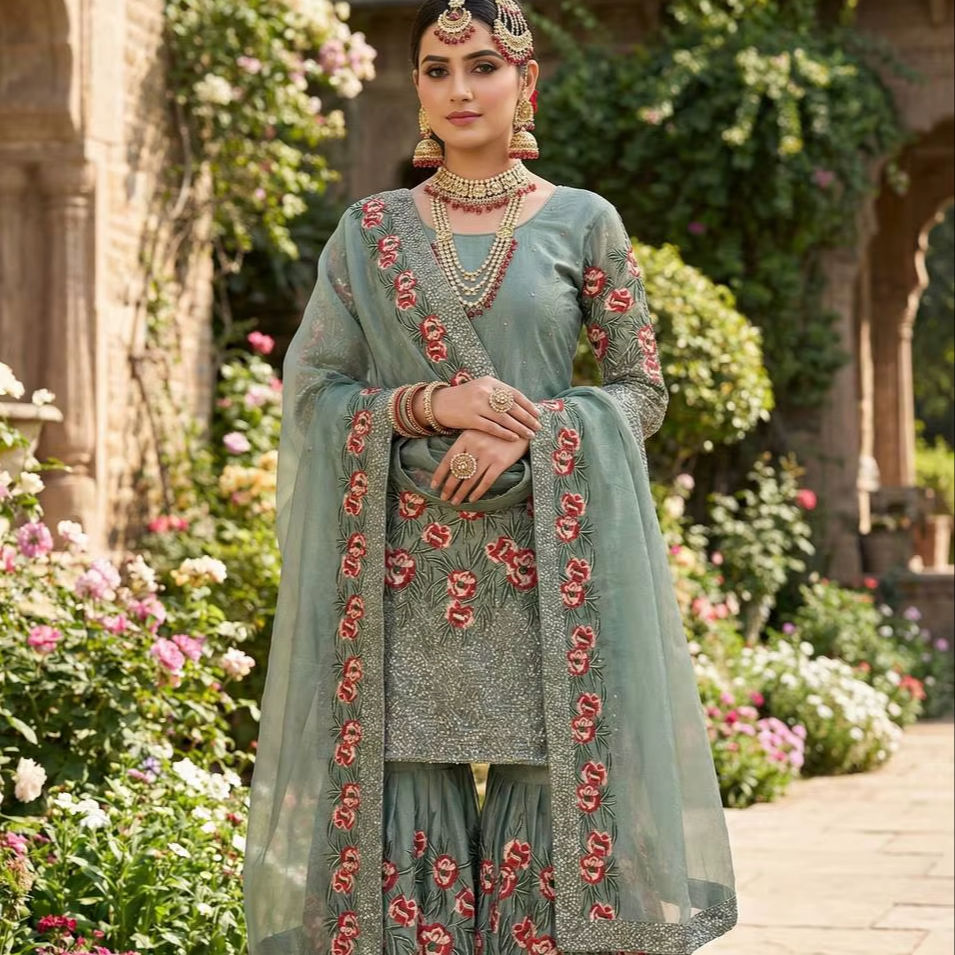 นำเสนอชุดออกงานดีไซน์ใหม่ล่าสุด ประกอบด้วยเสื้อท่อนบน, กางเกงทรงปล่อย, และผ้าคลุมไหล่ พร้อมงานปักสุดประณีต