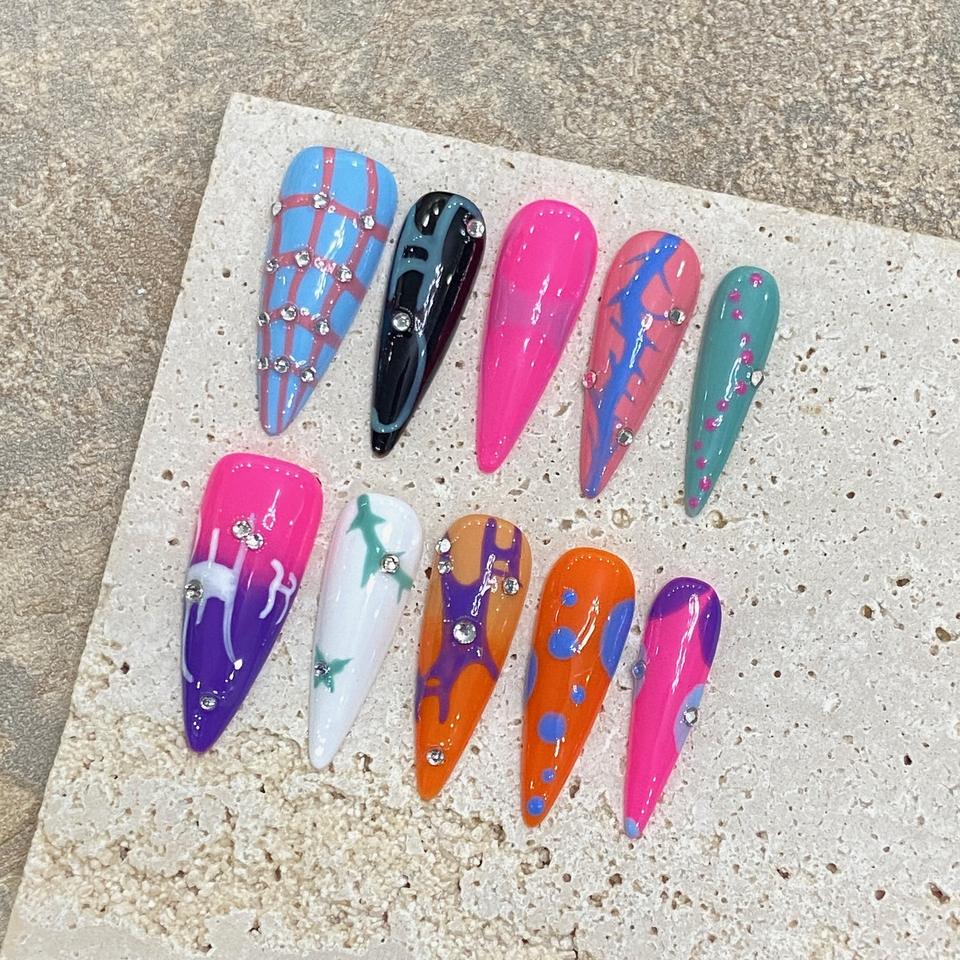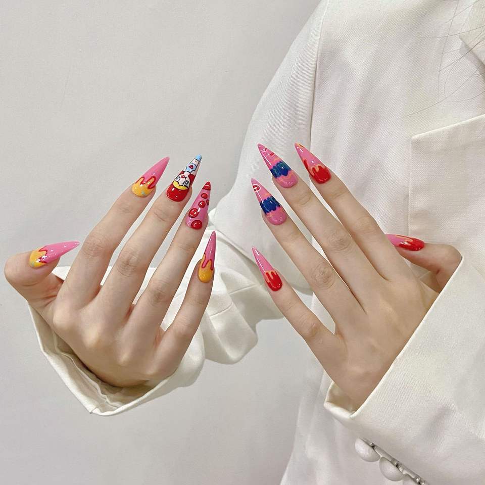 เล็บปลอมลายการ์ตูนน่ารัก ตำรวจหญิงบินได้ ลายวาดมือ ทรงสติลเลตโต้ 10 ชิ้น