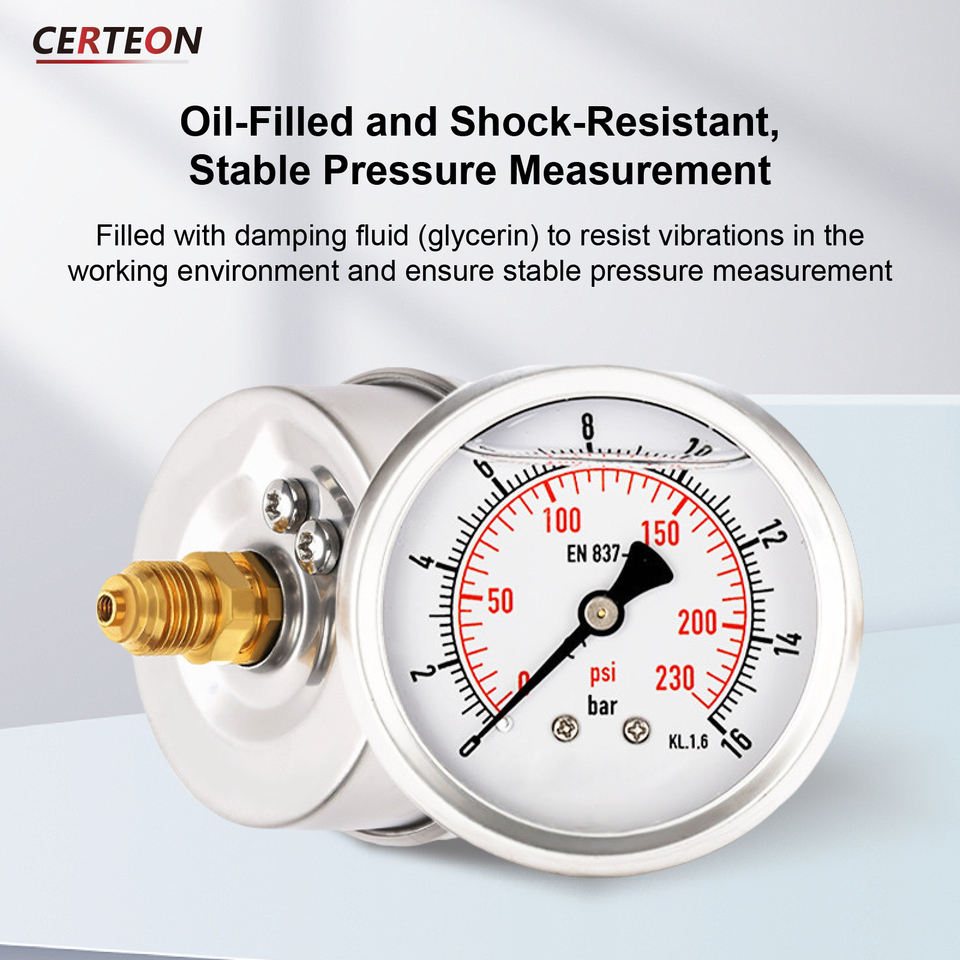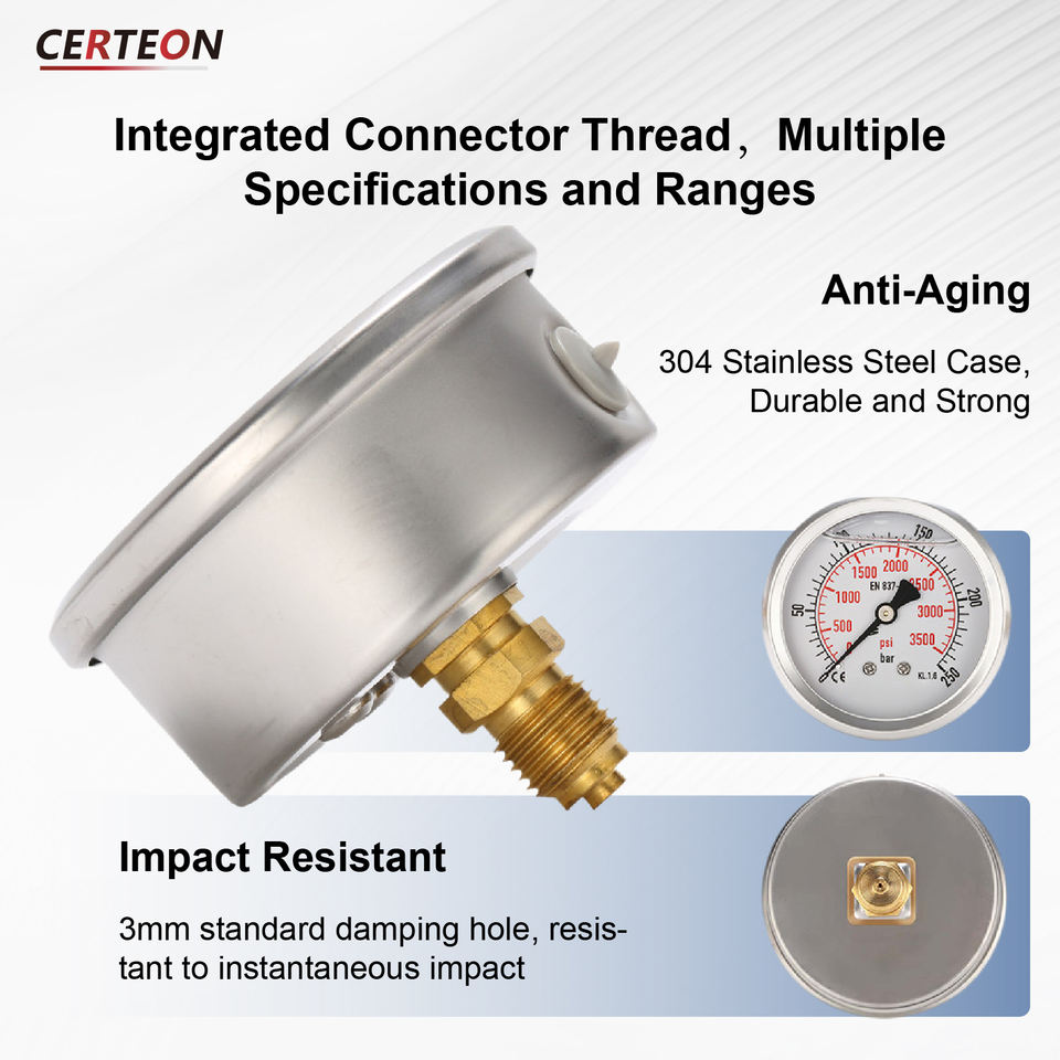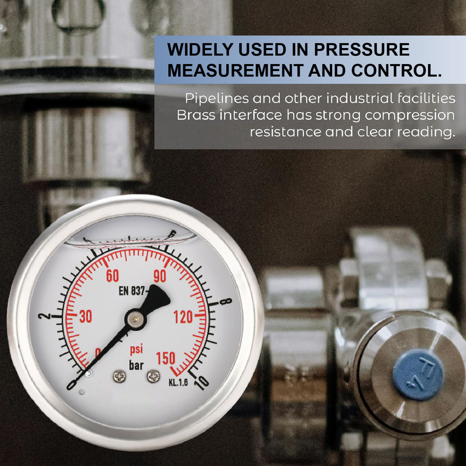 เกจวัดแรงดันสแตนเลสเติมของเหลวสเกลคู่Bar Psiความแม่นยำต้านการสั่นไหวใช้กับไอน้ำติดตั้งแนวแกน
