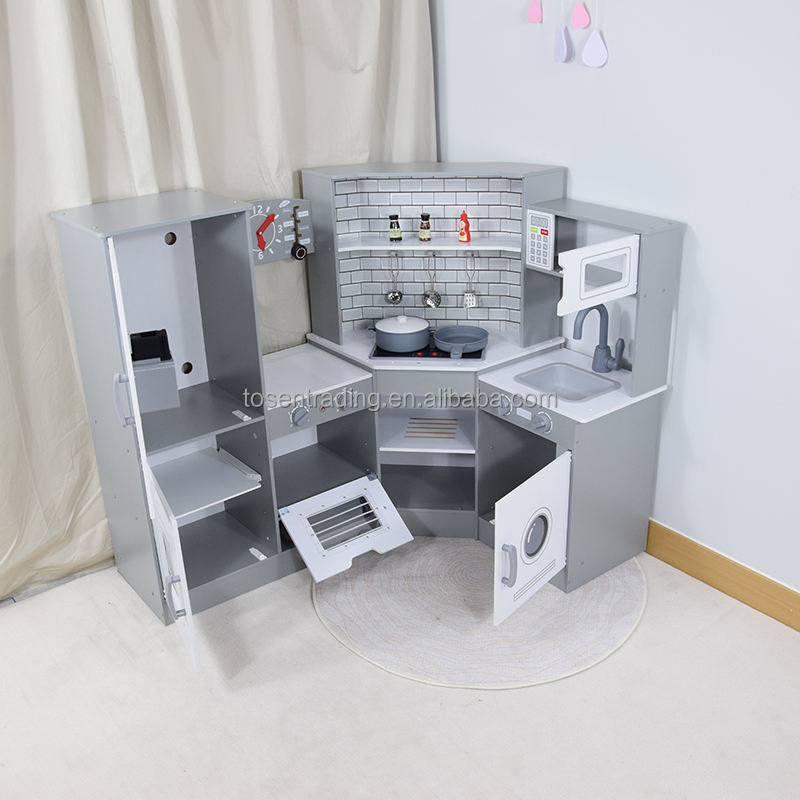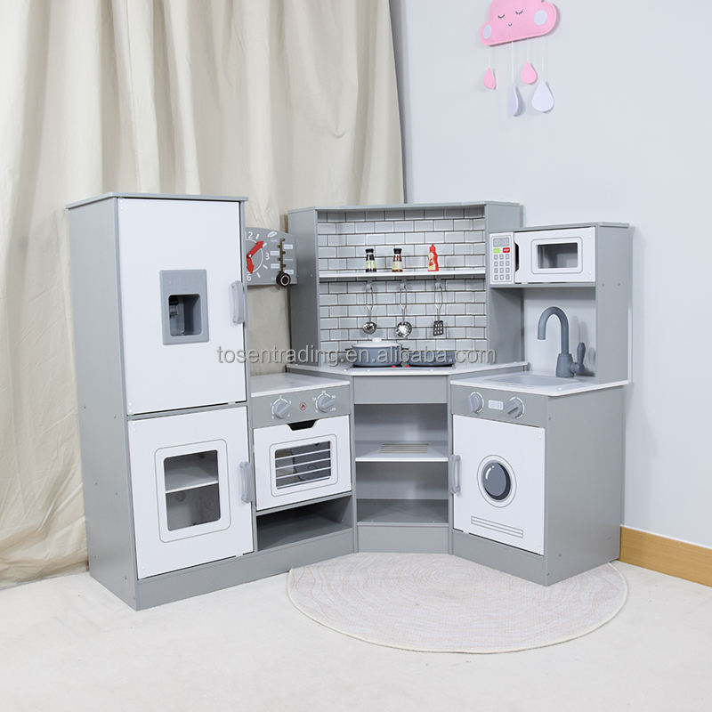 ชุดครัวไม้ขนาดใหญ่สำหรับเด็กเล่นบทบาทสมมติ พร้อมตู้เย็น เครื่องซักผ้า เตาอบ และไมโครเวฟ พร้อมหน้าจอแสดงผลดิจิตอลเสมือนจริง