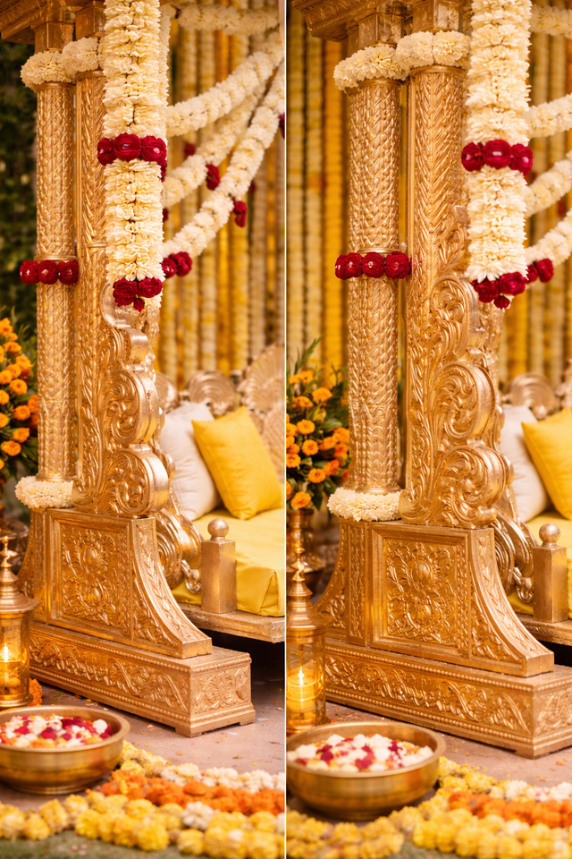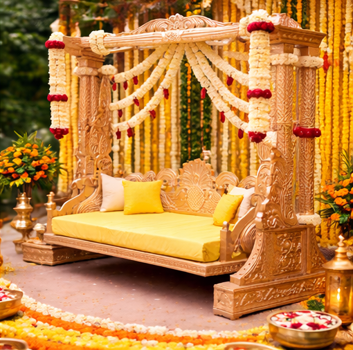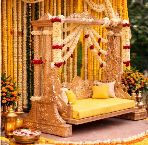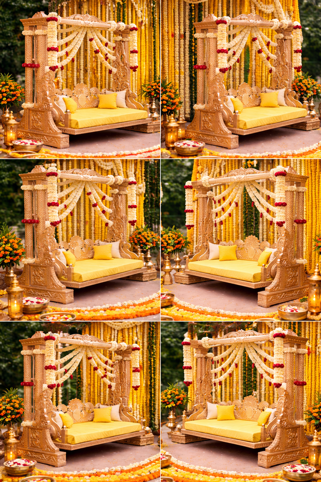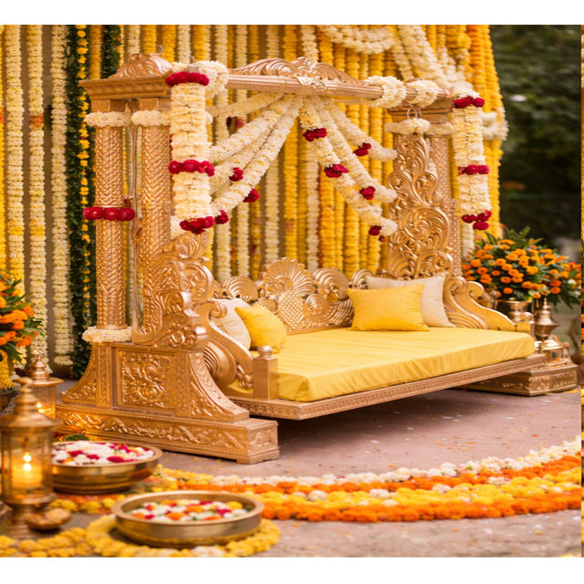ที่นั่งจูลาที่สวยงามที่สุดสำหรับพิธีฮัลดีบนเวทีกลางแจ้ง พิธีสังเกต์บนเวทีกลางแจ้ง ชิงช้าสีทอง พิธีเมห์นดีกลางคืนบนเวที ออนจัล สหราชอาณาจักร
