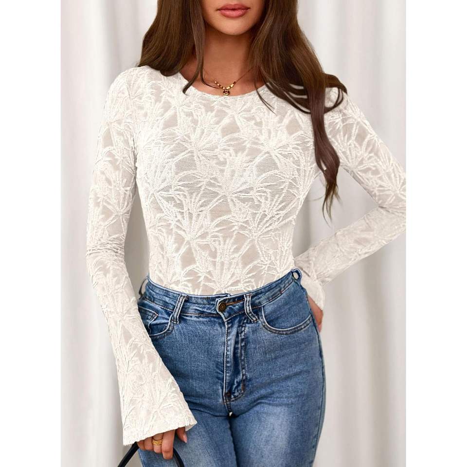 เสื้อเชิ้ตผู้หญิงลายดอกไม้คอลเลคชั่นฤดูใบไม้ร่วงปี 2025 แบบเซ็กซี่ซีทรู แขนยาวทรงกระดิ่ง ทรงเข้ารูป สไตล์ลำลอง เหมาะสำหรับใส่ออกไปข้างนอก