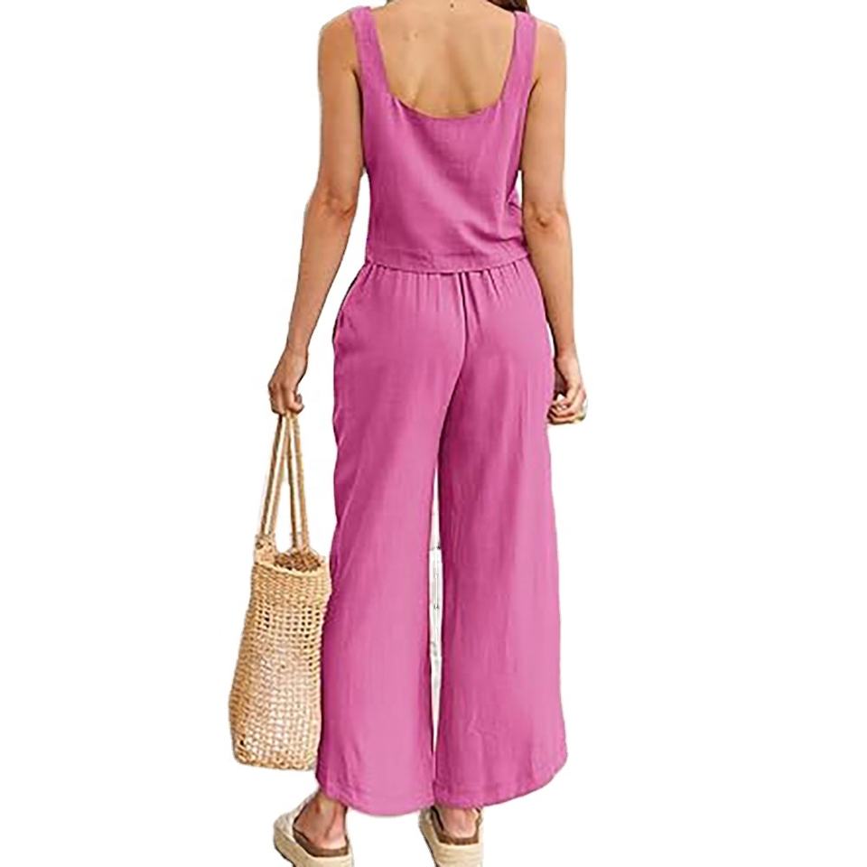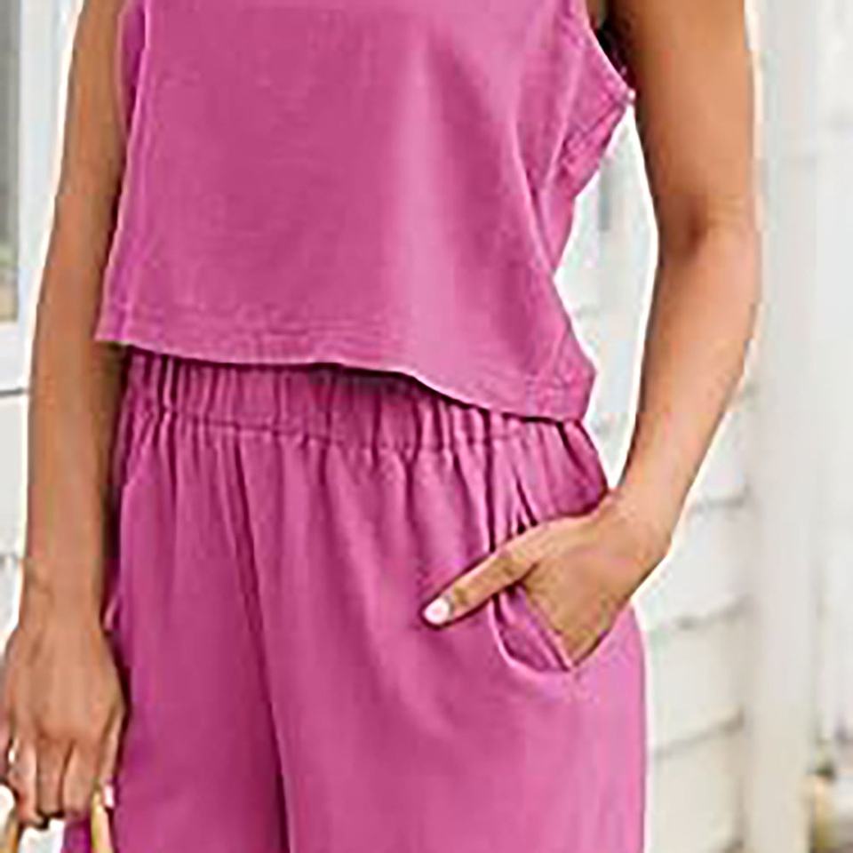 ชุดเสื้อผ้าถัก2ชิ้นสำหรับผู้หญิงเสื้อแขนสั้นผ้าลินินลำลองผ้าฝ้ายและกางเกงขายาวสีชมพูสวยใส่ฤดูร้อน