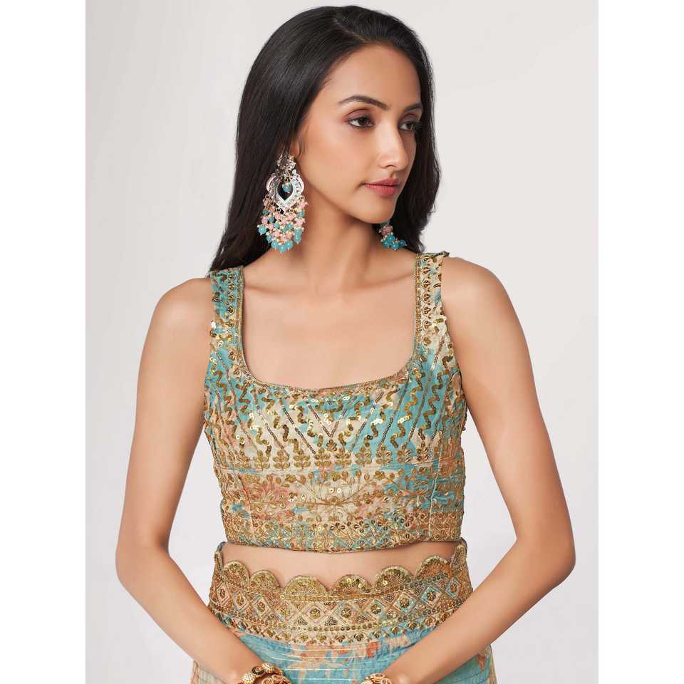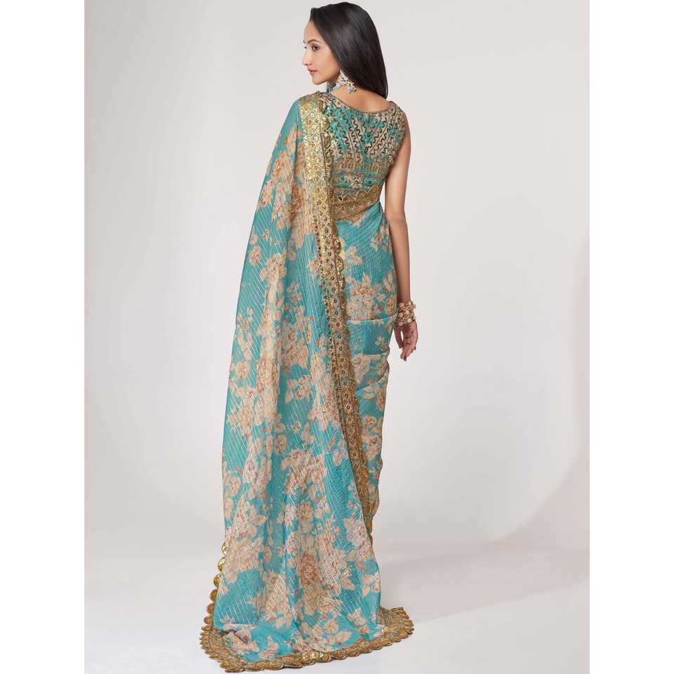 ชุดส่าหรีพร้อมเสื้อสตรีผ้าโปร่งบางพิมพ์ลายดอกไม้ท้องฟ้าสีฟ้าสวย
