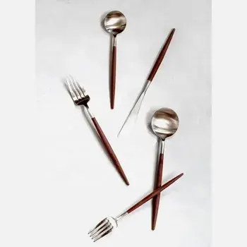 ชุดช้อนส้อมสแตนเลสพร้อมที่จับไม้เหมาะสำหรับงานแต่งงานและเครื่องครัว
