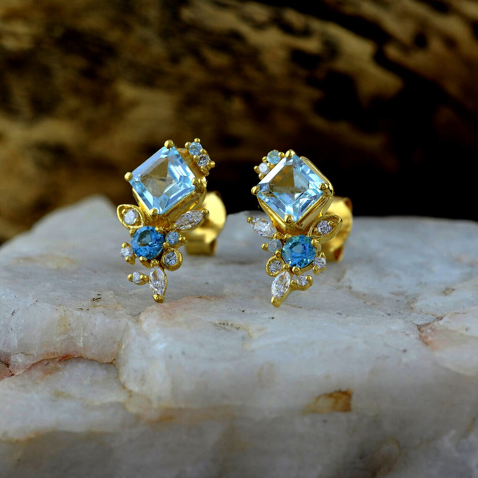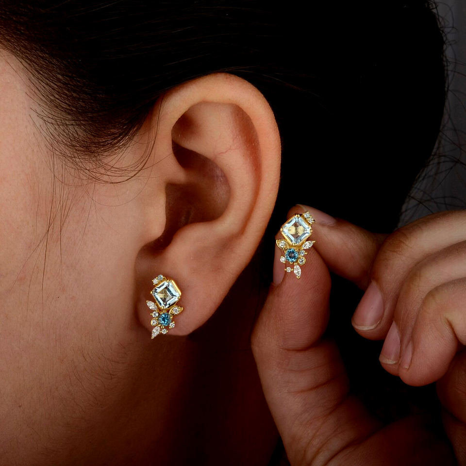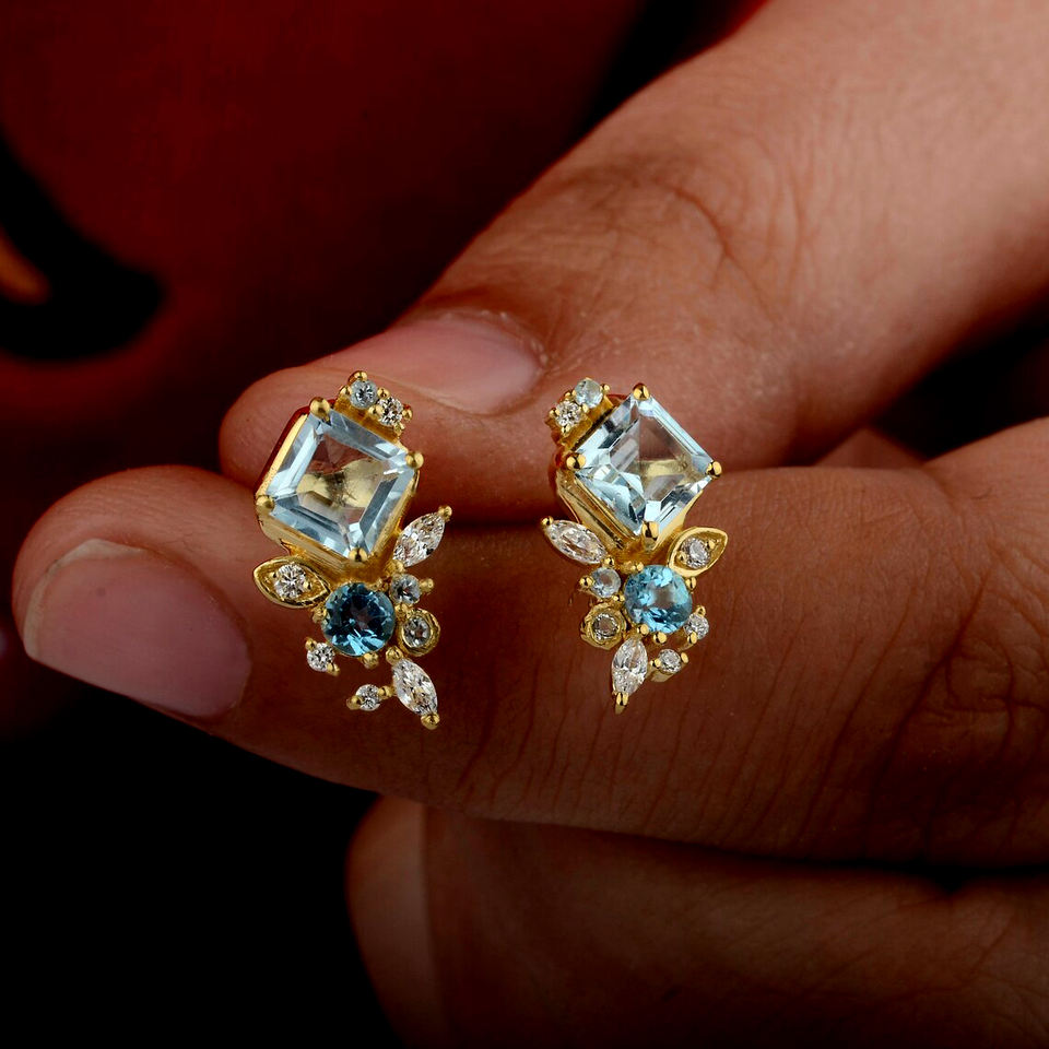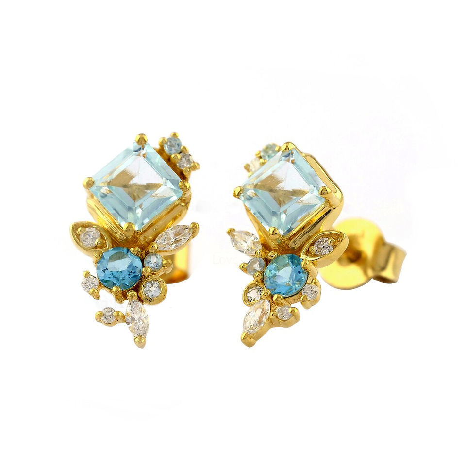 Princess Cut Aquamarine Blue Topaz Marquise Diamond Stud Earrings SI Clarity G-H Color Solid 14K Weddings Anniversaries Parties
