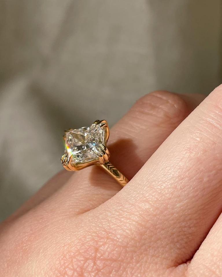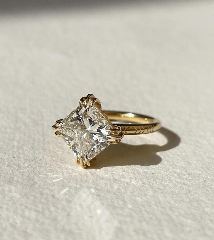 แหวนหมั้นเพชรทรงปรินเซสคัท เพชรเลี้ยงในห้องปฏิบัติการ ทองคำแท้ 14k ตัวเรือนแบบหนามเตยสามขา ลายเชฟรอน รับรองโดย IGI ระดับ VS+