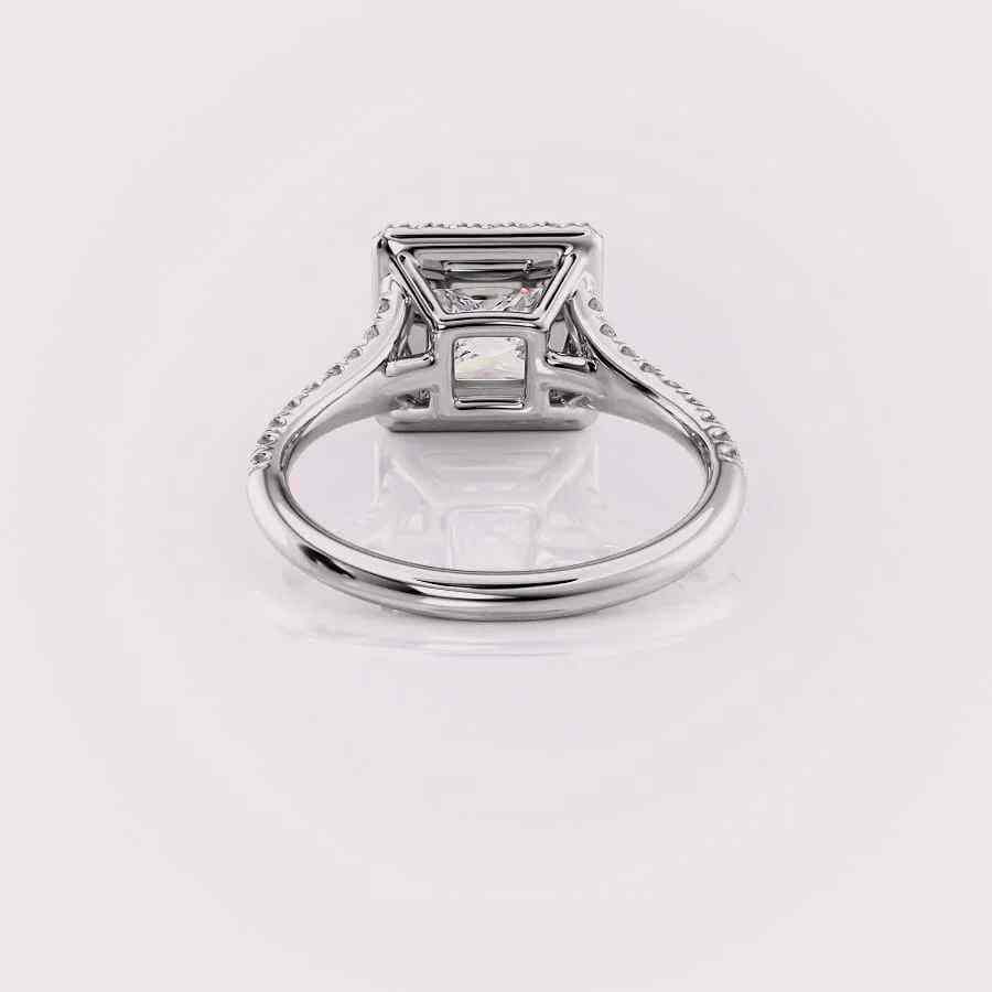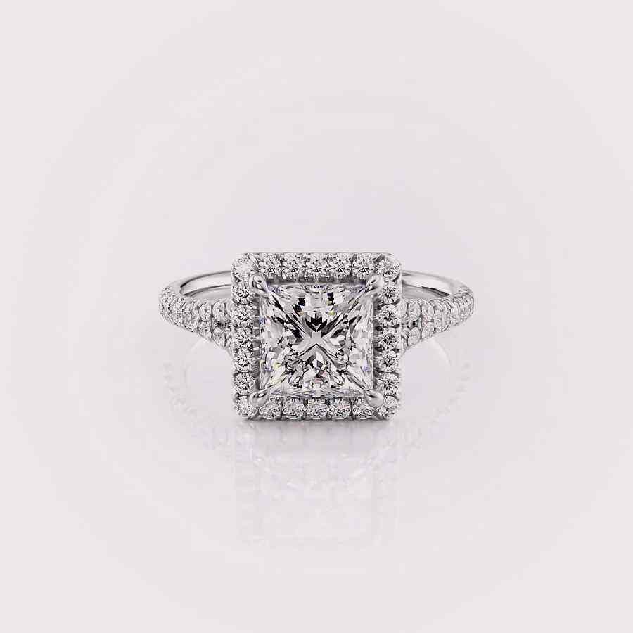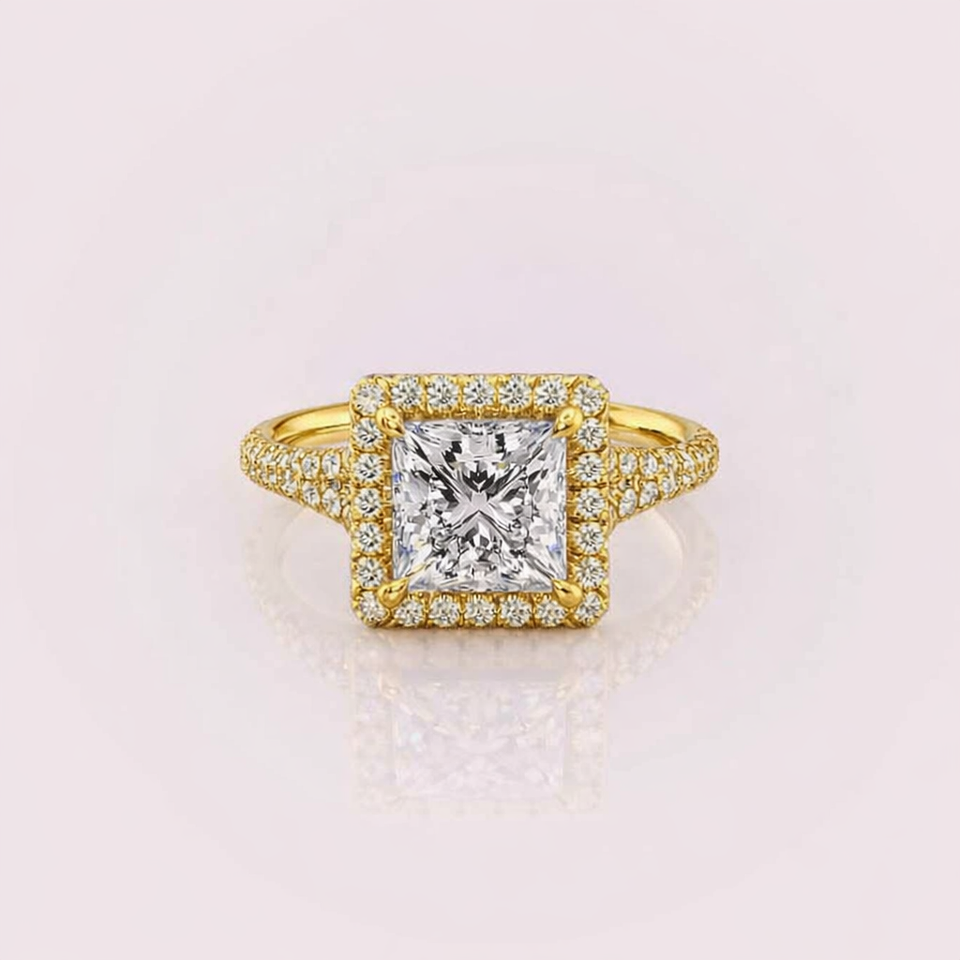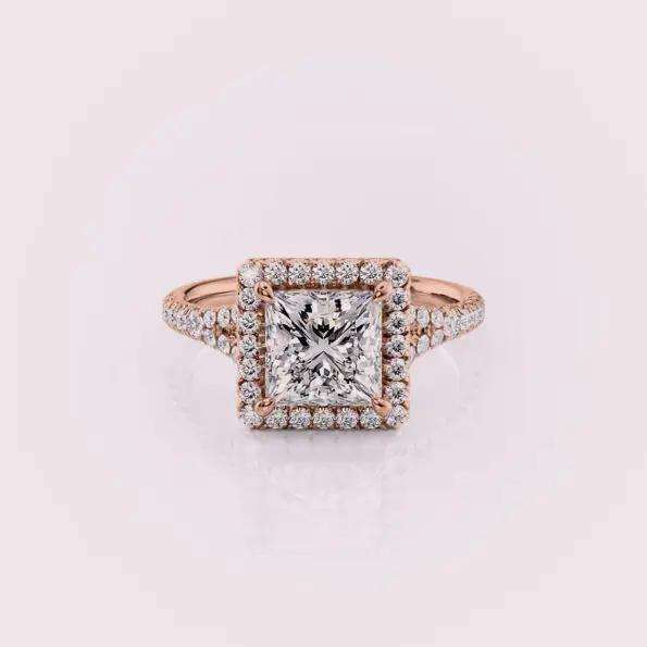 แหวนเพชรทรงปรินเซสคัทแบบเพาะเลี้ยงในห้องปฏิบัติการ ประดับด้วยเพชรแบบฮาโล วงแหวนประดับเพชรแบบพาเว่ ทองคำ 14 กะรัต สีโรสโกลด์ / สีเหลือง และสีขาว