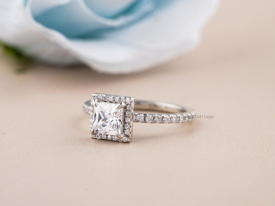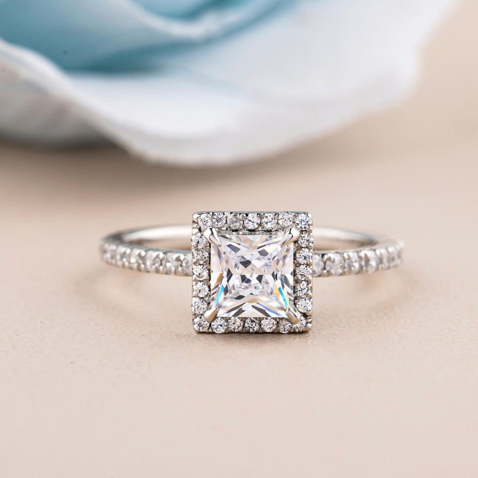 แหวนหมั้นเพชรเม็ดเพชรมออิสซาไนท์ตัดกับแหวนปูกับแหวนแต่งงานสีขาวทอง18K สำหรับเธอ