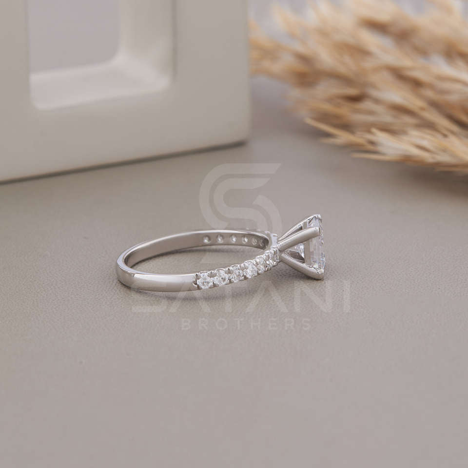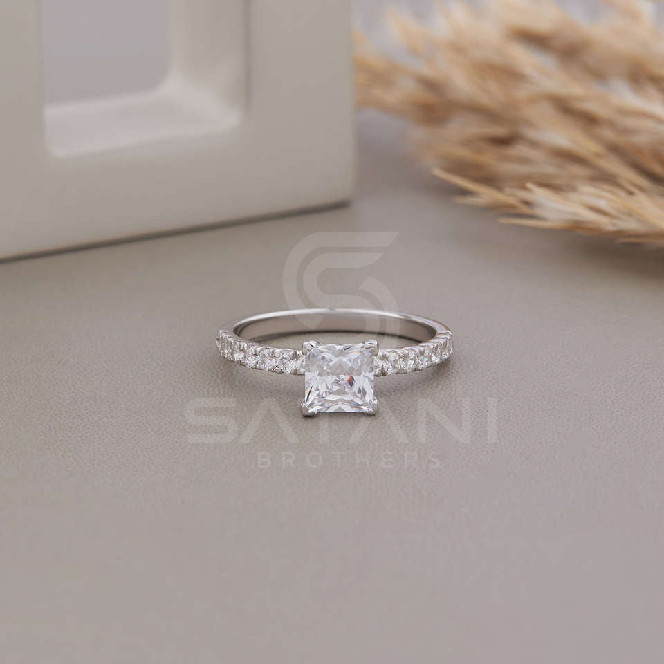แหวนหมั้นเพชรทรงเจ้าหญิงแบบโมอิสซาไนต์ ดีไซน์ครึ่งวงนิรันดร์ ประกายระยิบระยับ สวยหรู ดูดี