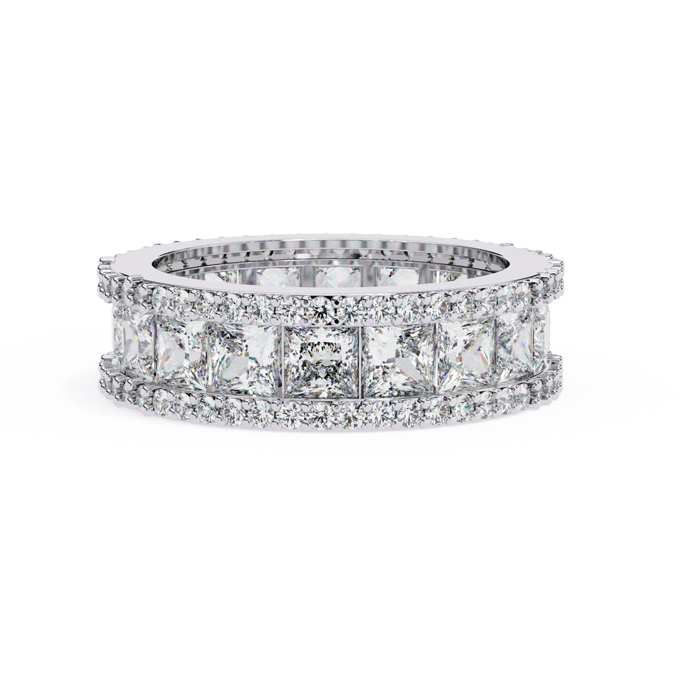 แหวนแต่งงานแบบสองแถวประดับเพชรโมอิสซาไนต์ทรงเจ้าหญิงขนาด 3.10 มม. 18 เม็ด และเพชรโมอิสซาไนต์ทรงกลมขนาด 1.20 มม. 100 เม็ด ทอง 14K