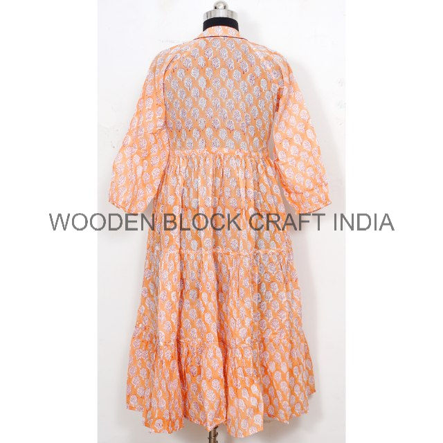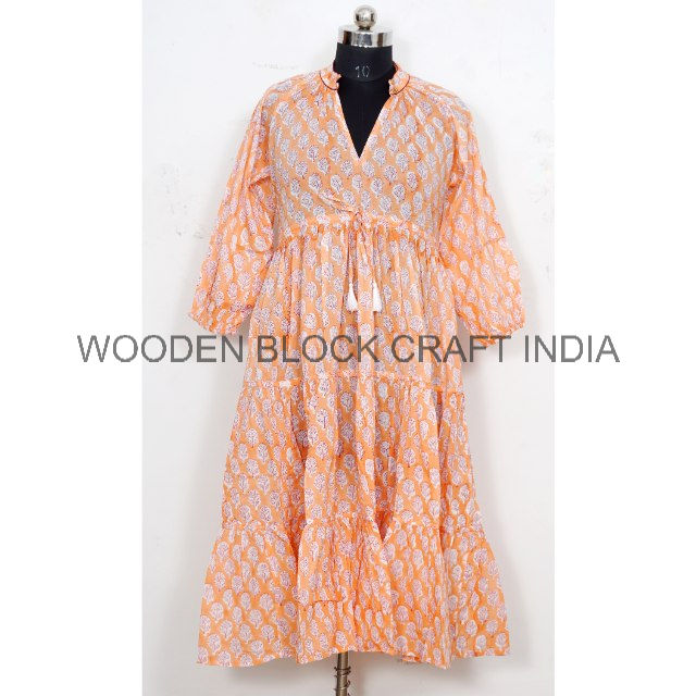 เดรสพิมพ์ลายยาวแบบลำลอง เดรสยาวปานกลางสไตล์โบฮีเมียนสำหรับใส่ลำลอง เดรสผ้าฝ้ายพิมพ์ลายบล็อกอินเดียสวยงามสำหรับผู้หญิง