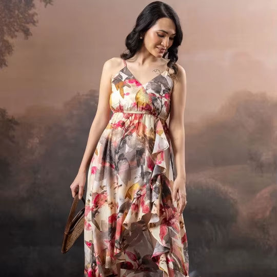 เดรสลายดอกไม้ผ้าจอร์เจตต์สีขาวมารูน ทรงเอ็มไพร์ สายเดี่ยว ไร้แขน เอวธรรมชาติ สำหรับงานเลี้ยงอย่างเป็นทางการ ความยาวปานกลาง สายคล้องไหล่แบบอสมมาตร