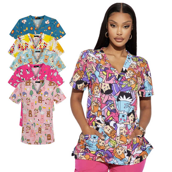 เสื้อสครับพิมพ์ลายคอวีไขว้สำหรับผู้หญิงพิมพ์ลายสำหรับใช้ในโรงพยาบาล