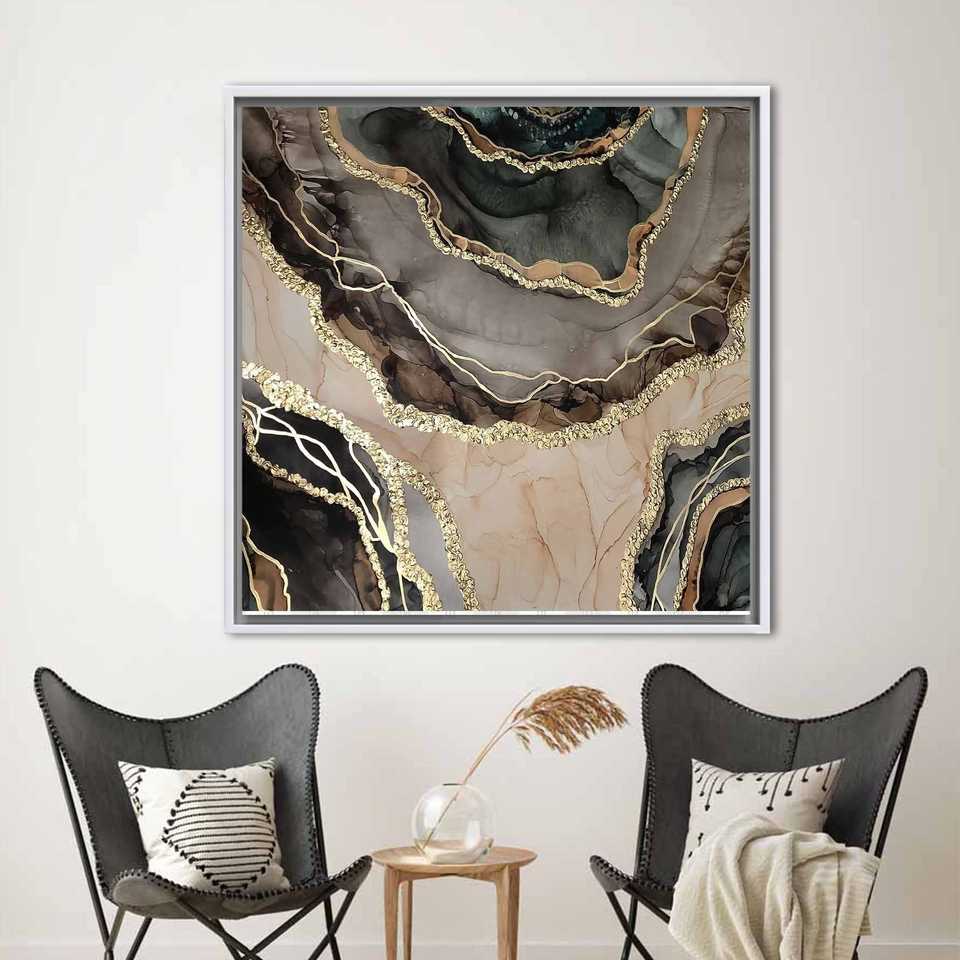 ภาพพิมพ์บนผ้าใบแคนวาสลายแอลกอฮอล์อิงค์แบบนามธรรม - ดีไซน์ลายหินอ่อนสีทองหรูหราทันสมัย พร้อมกรอบสีขาว