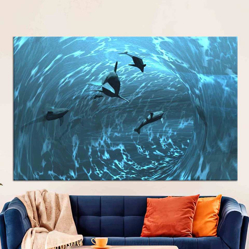 ภาพพิมพ์ปลา 3 มิติ สีน้ำเงินบนผ้าแคนวาส: ของตกแต่งตู้ปลาสไตล์ป๊อปอาร์ต, ผ้าแคนวาสแบบห่อ