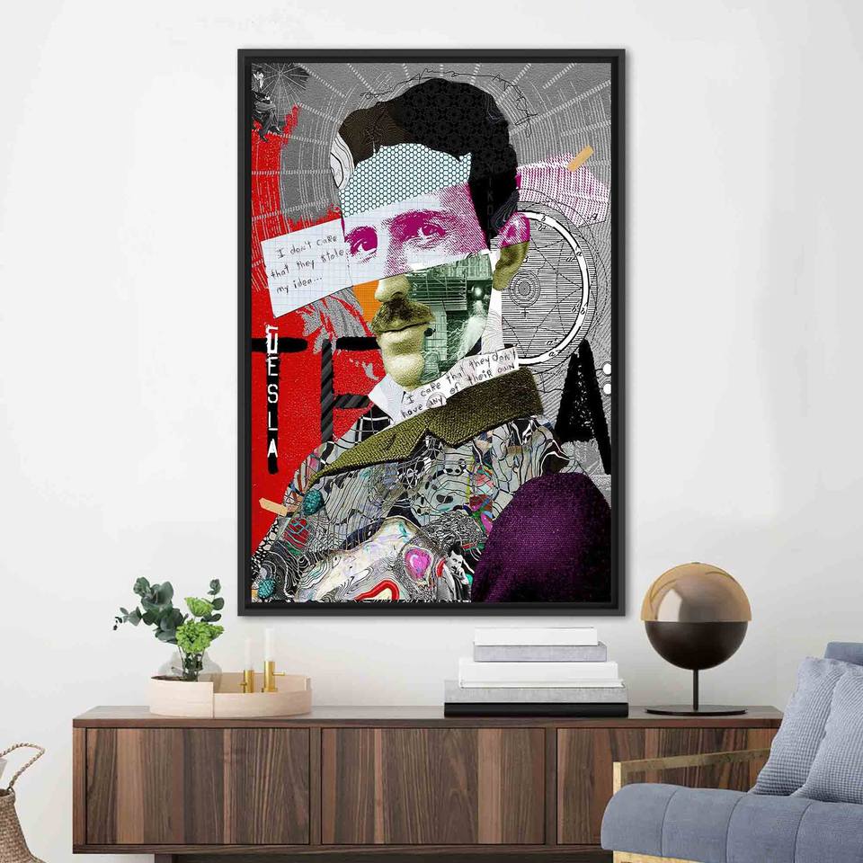 Printed Canvas: Abstract Nikola Tesla Graffiti Art, Modern Elegance,Black Framed