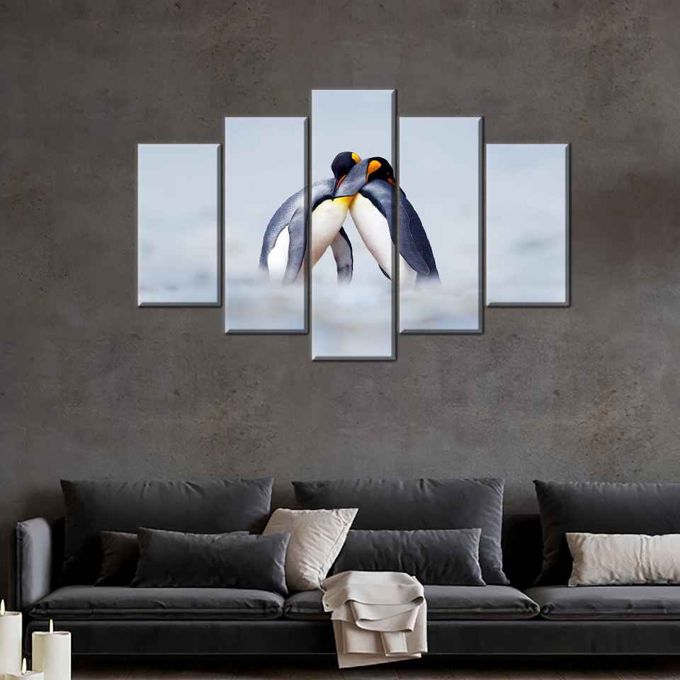 งานศิลปะบนผ้าใบพิมพ์ลาย: นกเพนกวินกำลังกอดกัน - ของตกแต่งห้องสุดหรู, ชุด 5 ชิ้น: แกลเลอรีแรป