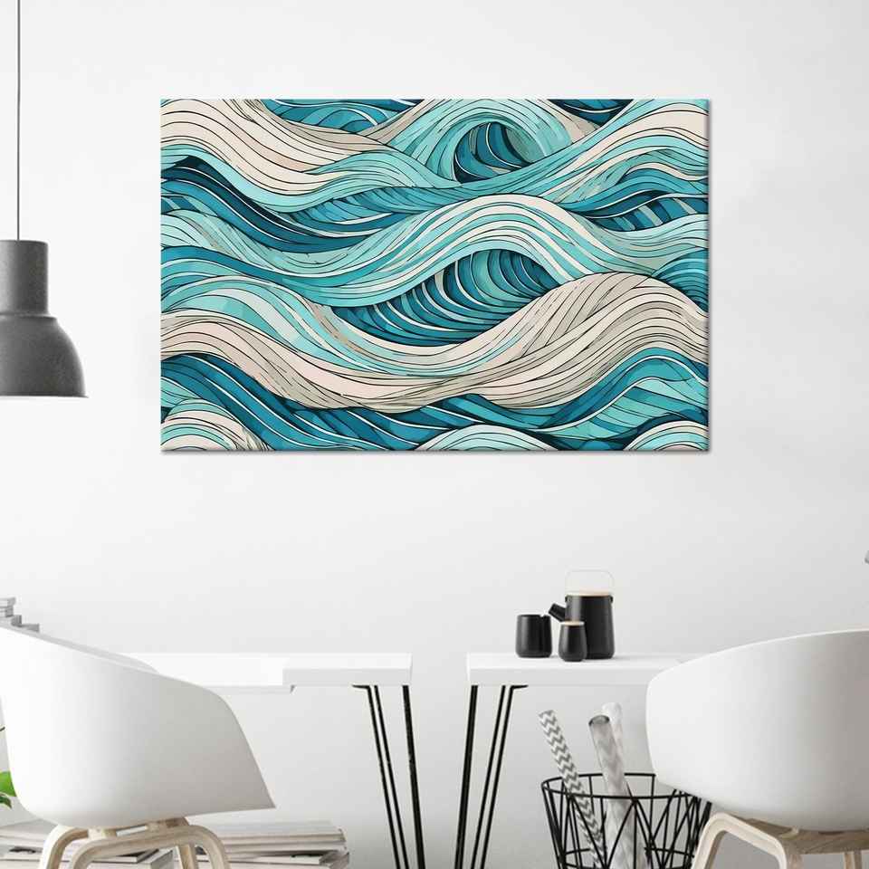 งานศิลปะบนผ้าใบพิมพ์ลาย: คลื่นทะเลสีฟ้าเบจ ตกแต่งสไตล์ชายฝั่ง ห่อหุ้มอย่างดี