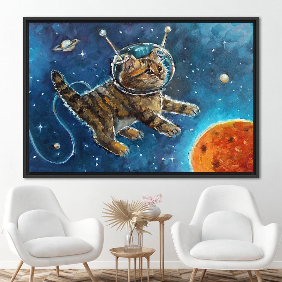 งานศิลปะบนผ้าใบพิมพ์ลาย: ของตกแต่งผนังรูปแมวนักบินอวกาศสำหรับห้องเด็ก,1P:กรอบสีดำ