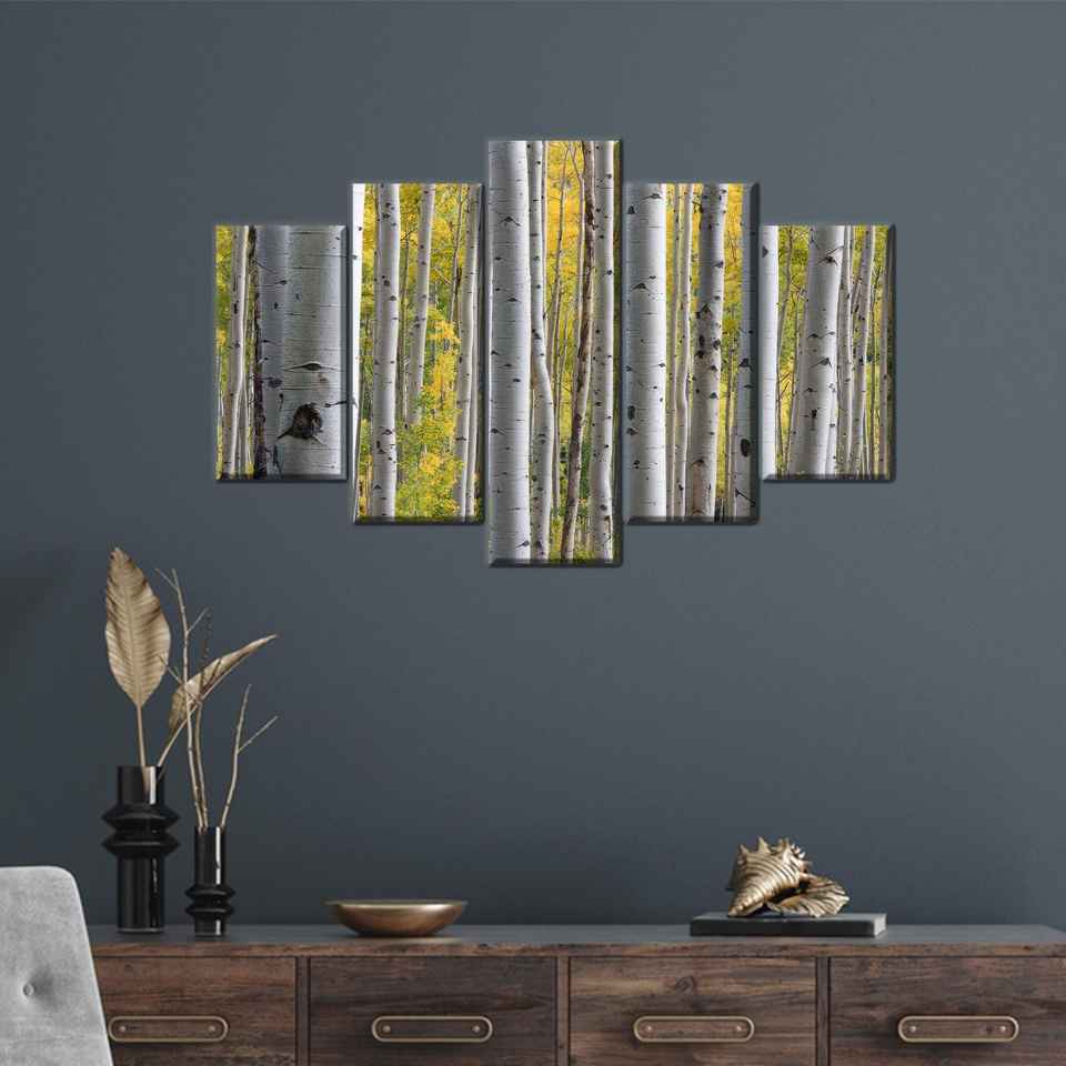 งานศิลปะบนผ้าใบพิมพ์ลาย: ฉากป่าเบิร์ชโกรฟสำหรับตกแต่งห้องนอนอย่างหรูหรา, ชุด 5 ชิ้น: แกลเลอรี่แรป