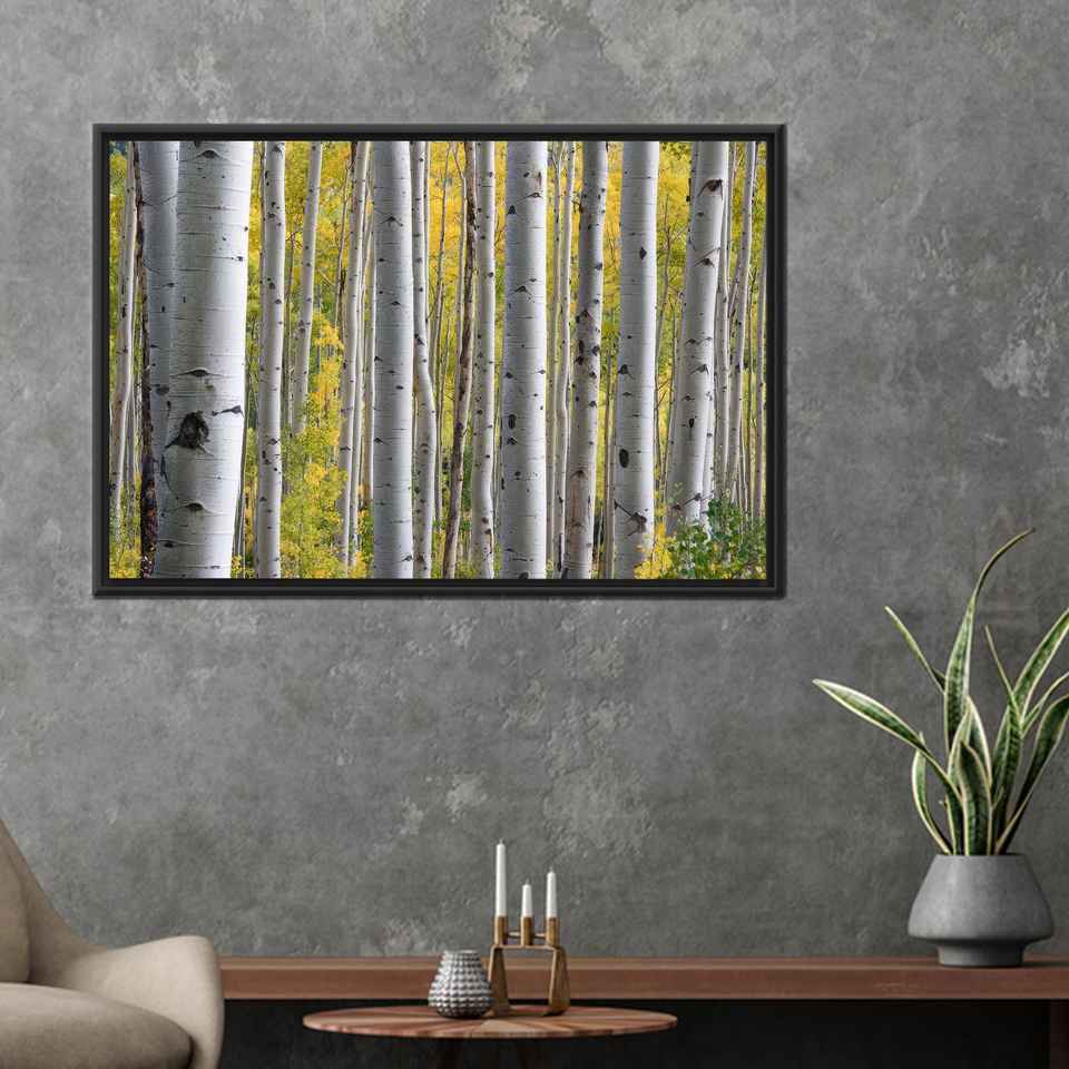 งานศิลปะบนผ้าใบพิมพ์ลาย: ป่าเบิร์ชในบรรยากาศแห่งความสงบในป่า,1P:กรอบสีดำ