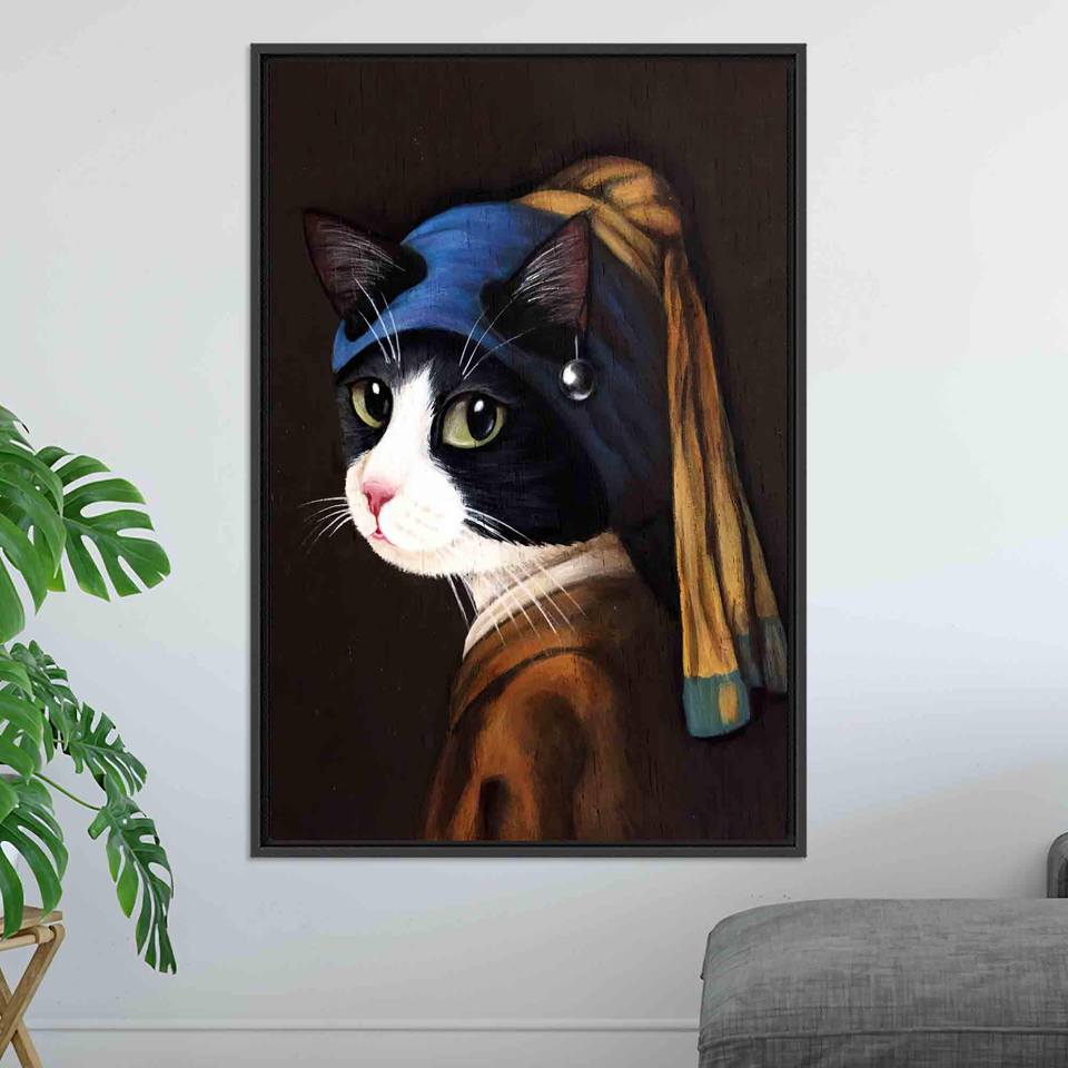 งานศิลปะบนผ้าใบพิมพ์ลาย: แมวสุดสง่างามพร้อมการตกแต่งต่างหูมุก, ผ้าใบกรอบสีดำ