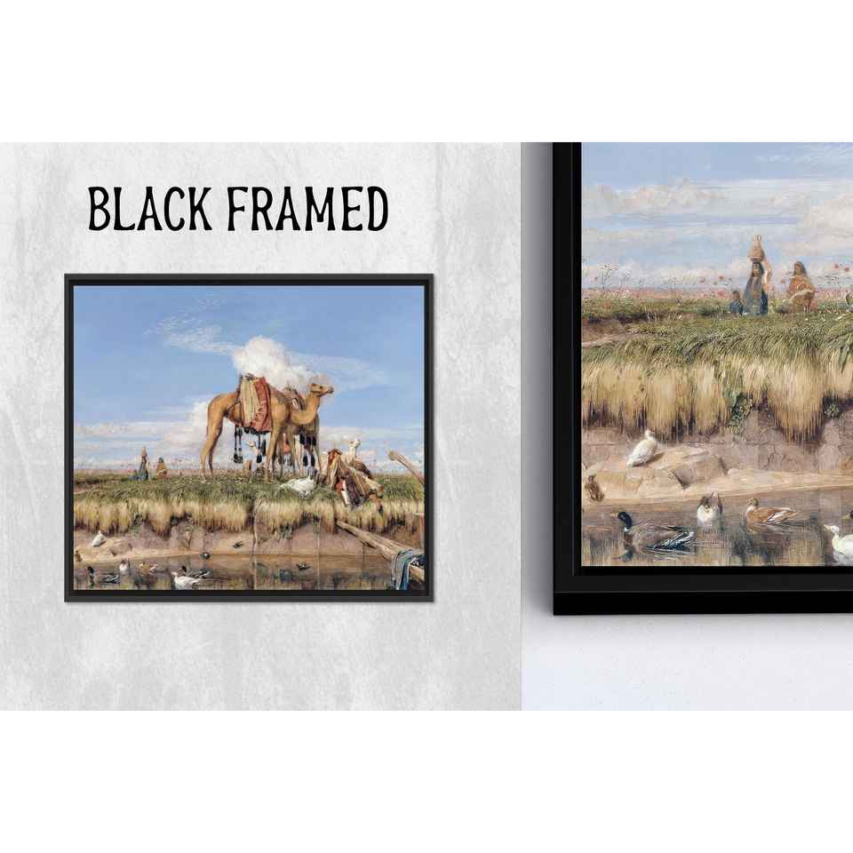 งานศิลปะบนผ้าใบพิมพ์ลาย: ภาพศิลปะอียิปต์ที่งดงาม ภาพวาดแม่น้ำไนล์ ผ้าใบพิมพ์ลายสีดำ 1 ชิ้น