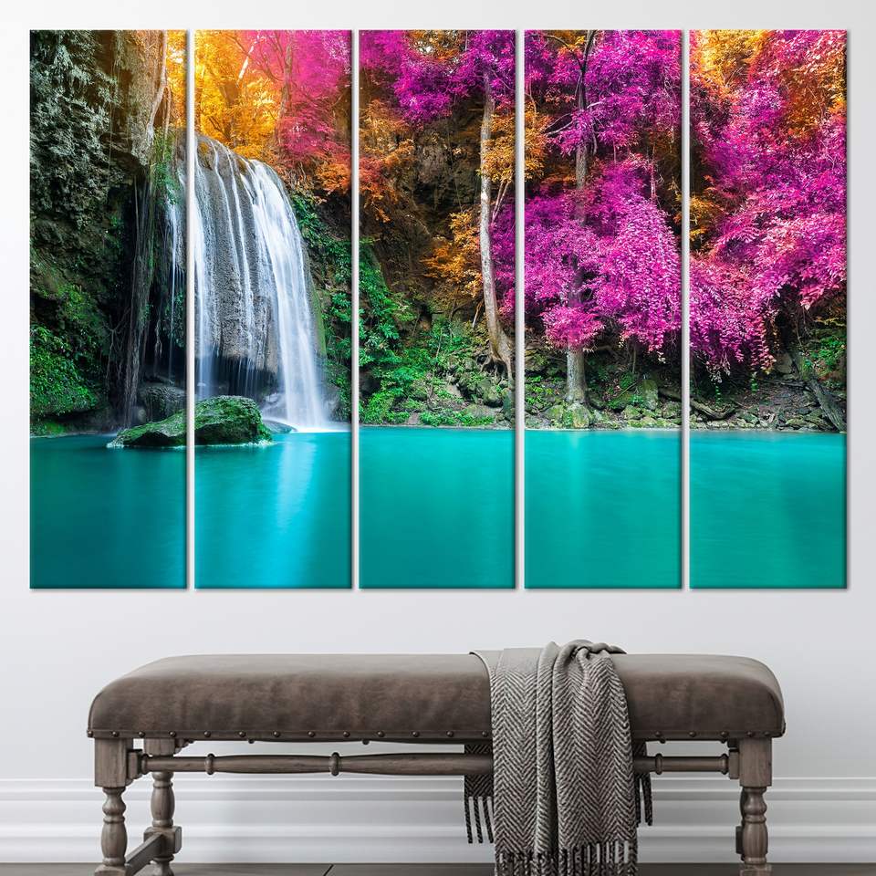 งานศิลปะบนผ้าใบพิมพ์ลาย: ภาพวิวธรรมชาติต้นไม้สีม่วง ดีไซน์กราฟิก ชุดผ้าใบ 5 ชิ้น