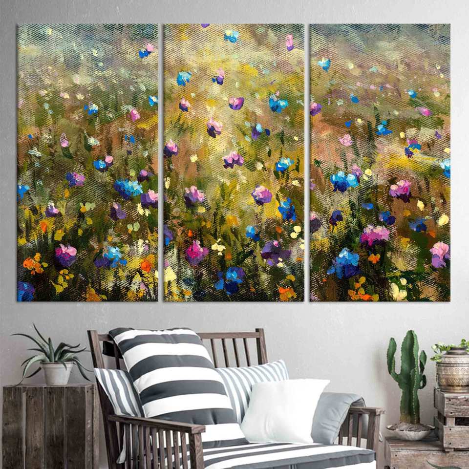 งานศิลปะบนผ้าใบพิมพ์ลาย: ของตกแต่งผนังกระจก ลายทุ่งดอกไม้ป่า พิมพ์ลายดอกไม้สมัยใหม่ ชุดผ้าใบ 3 ชิ้น