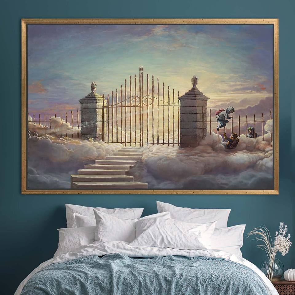 ผ้าใบพิมพ์ลาย: ภาพศิลปะแนวสตรีทของแบงก์ซี่ ลายเพิร์ลลี เกตส์ ตกแต่งแบบนามธรรม,1P:กรอบสีทอง