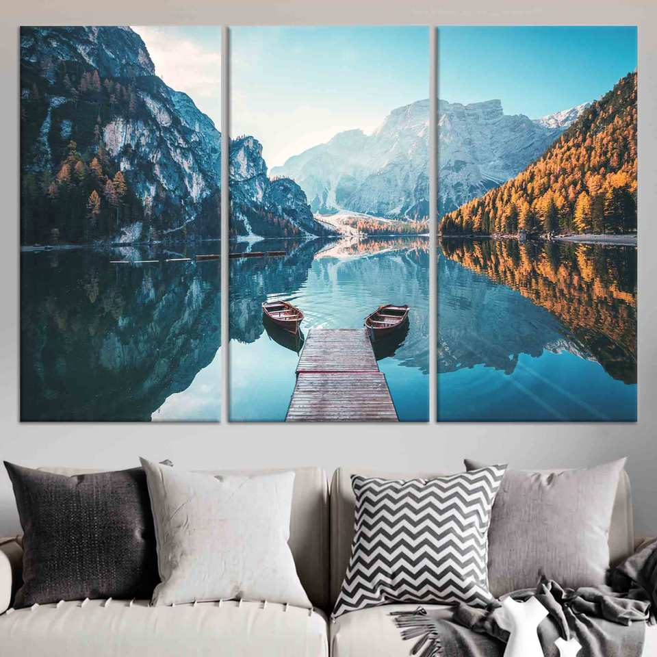 ผ้าใบพิมพ์ลาย: ทะเลสาบเบรย์ส ภูเขาโดโลไมต์ ภาพตกแต่งผนังภูเขา ชุดผ้าใบ 3 ชิ้น